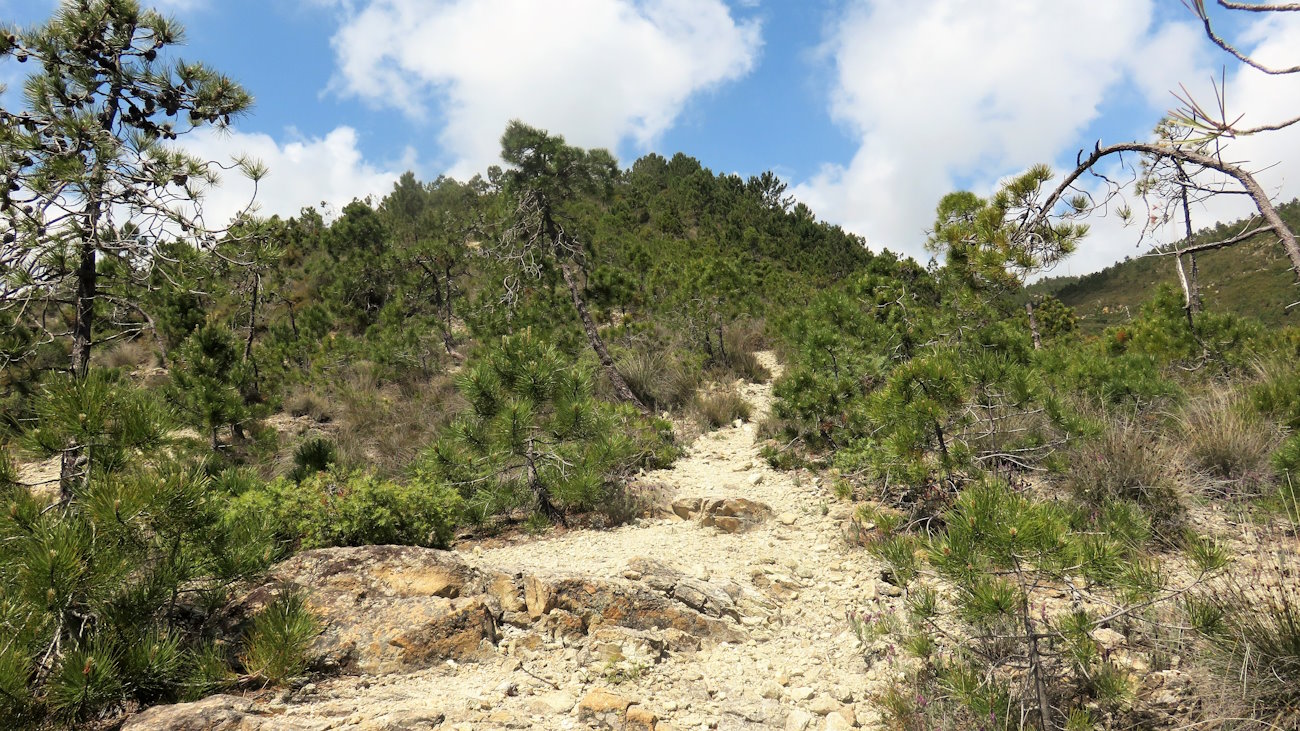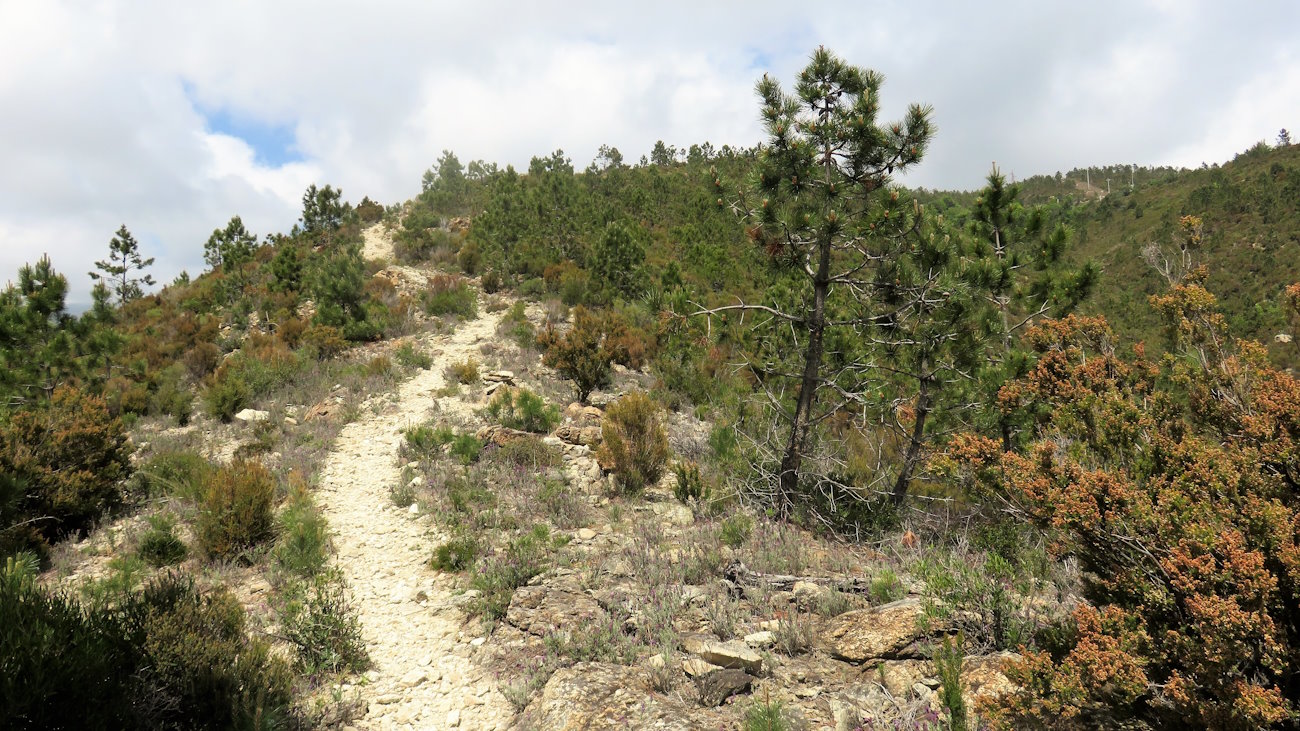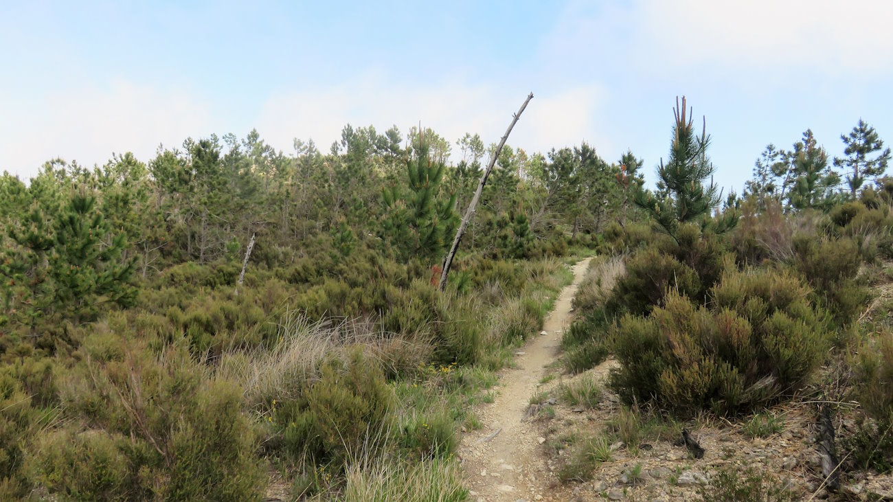 Riprendo la salita che rimane sempre piuttosto morbida e graduale tra arbusti e pini marittimi molto radi, capaci di dare quel tocco in più al paesaggio. Qualcosa però non quadra e lo capisco subito osservando attentamente la vegetazione, troppo rada e con macchie isolate. Scoprirò poi che questi versanti sono stati interessati da due incendi dolosi, alla fine degli anni ’90 e nei primi anni del 2000. La natura ha vinto anche questa volta la battaglia contro l’uomo e si è riappropriata dei suoi spazi.