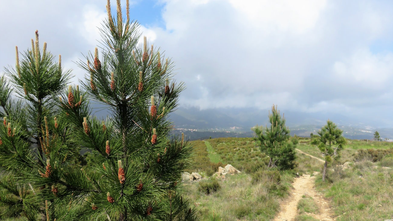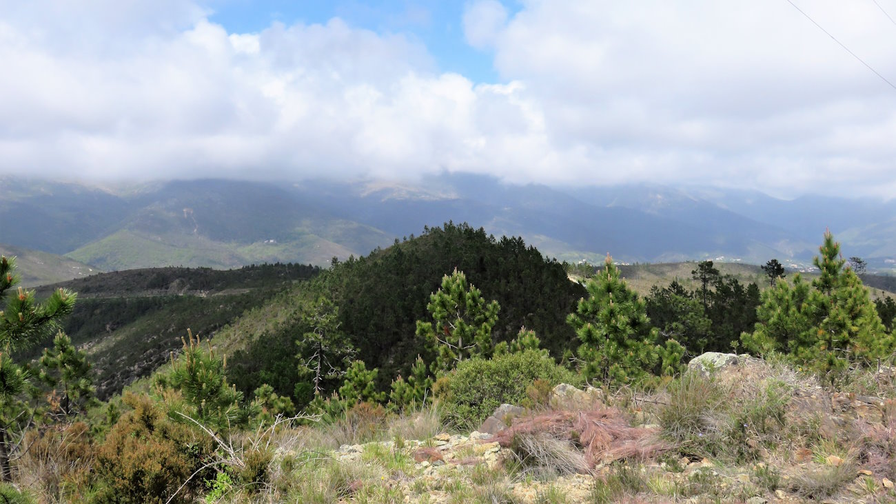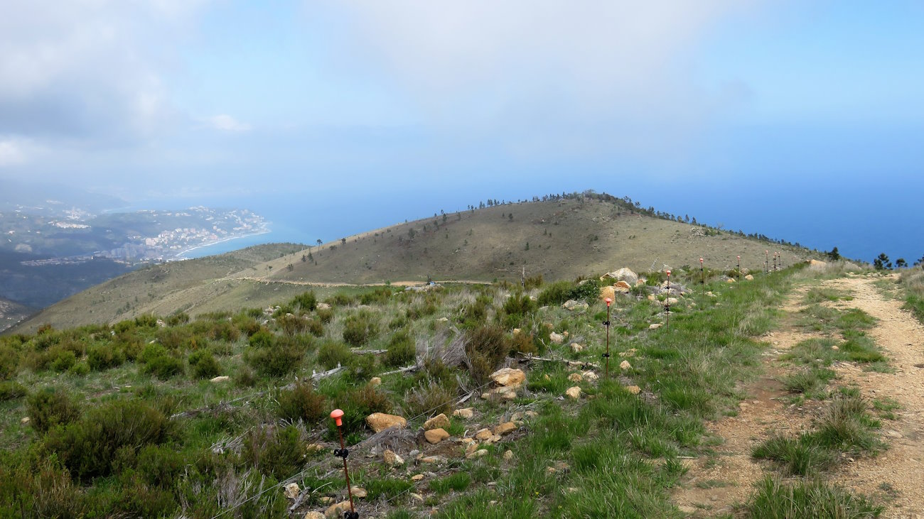 Aggiro l’anticima del Monte Grosso e quella del Bric Piano delle Donne. Purtroppo non è possibile salire fin sulla sommità e occorre stare sull’ampio sentiero. Tutti questi prati sono infatti recintati con un filo in cui passa la corrente elettrica per il bestiame, per cui queste zone sono a loro uso esclusivo. In questo punto i pini sono molto radi mentre erba e piccoli arbusti la fanno da padrone. Il mare si vede a sprazzi e in punti in cui la montagna mostra qualche segno di debolezza. In compenso l’aria pulita e la brezza marina sono un toccasana per l’organismo, qui si respira a pieni polmoni! Un piccolo paradiso raggiunto con poco sforzo (almeno finora, ma la discesa...)