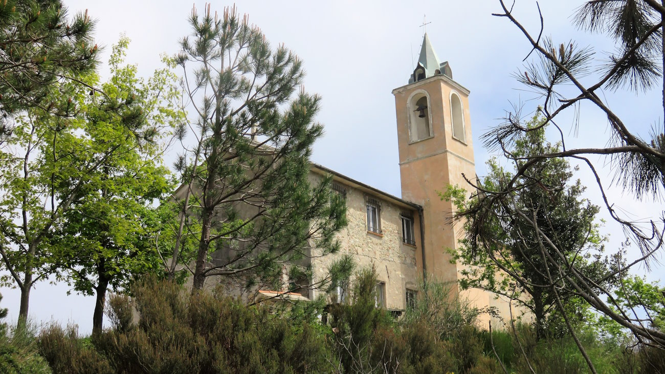 Sul lato monti la situazione non cambia, le nubi continuano ad avvolgere il Beigua, cima più elevata di questa porzione di Appennino Ligure. Al santuario incontro tre ciclisti e una coppia intenta a prendere il sole sul terrazzino erboso antistante e a picco sul mare, sfidando il vento che qui soffia quasi ogni giorno implacabile. La posizione di questo santuario è magnifica, un terrazzo naturale circondato dalla vegetazione e verticale sul mare. Tutto intorno tavoli da picnic e, un po’ più spostata, una piccola cappella. Meta ideale per famiglie con bambini che possono uscire dai rumori e dal caos del paese sottostante.