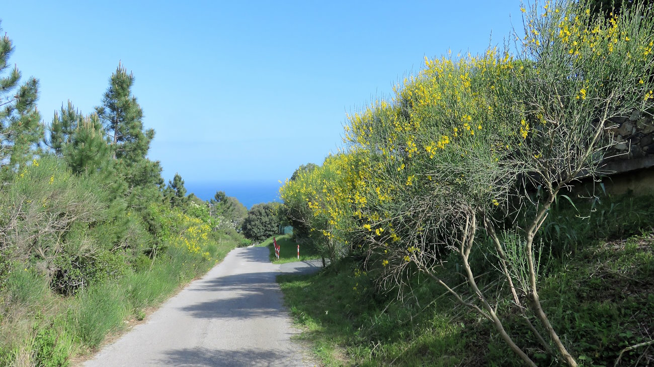 Svolto a destra su asfalto, della giapponesina non v’è più traccia. Volatilizzata. Seguo la strada in un tratto pieno di ginestre gialle, molto carino, con il mare sullo sfondo. Il mio obiettivo è ora andare a prendere il Lungomare Europa che collega Varazze con Cogoleto ed erroneamente penso sia la cosa più facile di questo mondo. Sbagliato. La parte più facile è alle spalle ed è stata, pur senza segnaletica, quella in quota.