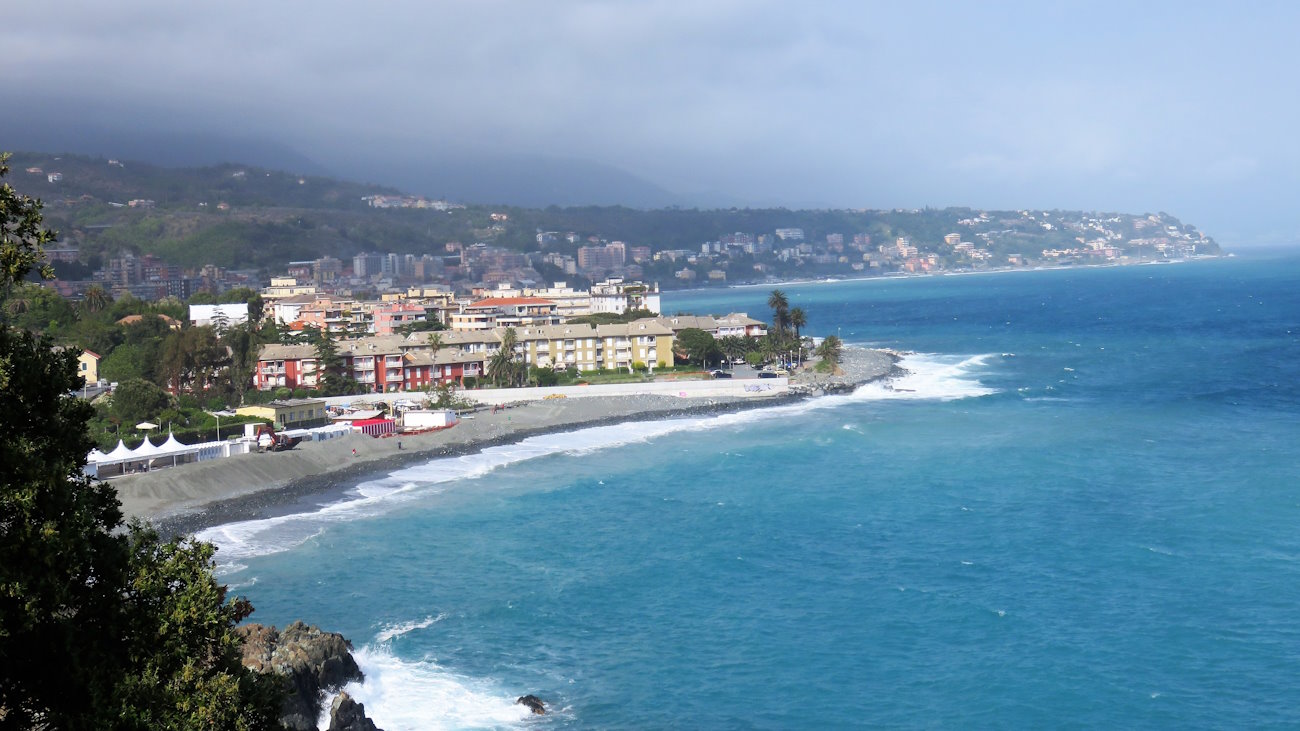 Fisso la mia partenza sul lungomare di Varazze nei pressi della chiesa di Santa Caterina. È primo pomeriggio e c’è un po’ di vento ma le nubi che fino ad ora hanno imperversato si diradano, aprendosi ad un sole brillante. Il mare è molto mosso e, alle mie spalle, lo sento ruggire.