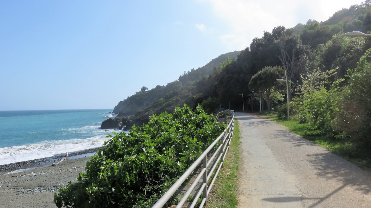 Altro rettilineo, altra curva. Oltrepasso una casa lungo la statale e mi porto in corrispondenza di un altro torrente, il Rian da Fasa Carrubba, dove, inaspettatamente un sentiero di pochi metri seminascosto tra le piante porta proprio sul lungomare. Mi faccio letteralmente largo tra erba alta e rami, così da spuntare improvvisamente nel mezzo del lungomare.