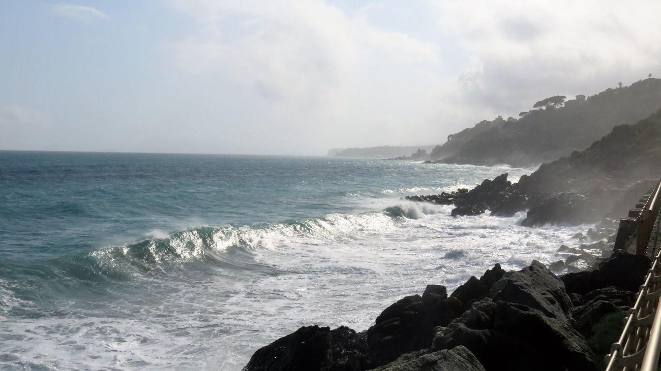 Un litorale molto selvaggio e suggestivo che il mare così mosso rende ancora più interessante. Sono veri e propri boati che risuonano tra questi scogli quando le onde si schiantano. Distratto da tutta questa esplosione di suoni e colori e complice la quasi assenza di gente (strano, ma secondo me stanno tutti esplorando la via per la quale sono sceso) che amplifica maggiormente il silenzio, mi ritrovo all’inizio di Varazze dove termina anche questa passeggiata e anche il mio meraviglioso e rocambolesco giro.