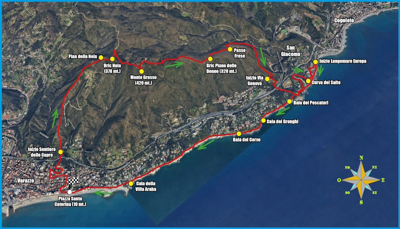 Da Piazza Santa Caterina a Varazze (10 mt.) si imbocca verso nord Via Nino Bixio che aggira la chiesa di San Domenico e prosegue dritta. Si trascura sulla sinistra Via Giuseppe Garibaldi per svolrare più avanti, sempre a sinistra, in Via Gaggino che si percorre interamente, fino a sbucare in Via Cavour. Qui, si svolta a destra (nord) fino al primo incrocio, dove sulla destra si entra in Via Don Minzoni. Si prosegue innanzi fino ad attraversare il ponte sull’Autostrada dei Fiori. Subito dopo, sulla sinistra si stacca un viottolo cementato che in breve si trasforma in sentiero sterrato che sale per la macchia mediterranea: il Sentiero delle Capre. Ci si alza fino a percorrere una dorsale, ignorando le deviazioni sulla destra e sulla sinistra, che porterebbero ad alcune case. Quasi al termine della salita il sentiero costeggia una recinzione fino ad un bivio nel quale si trovano anche alcuni tralicci. Si prosegue sulla destra per attraversare, dopo pochi metri, il Pian della Nola, e quindi giungere sul Bric Noia (378 mt., 1h 15’). Dalla sua sommità si prosegue in discesa per un breve tratto verso nord (è l’unica via possibile) per uscire poi in una grande strada sterrata. Qui si svolta a destra in direzione del Monte Grosso col Santuario di Ns. Signora della Guardia (già visibile). Per toccare il punto panoramico sul Monte Grosso (420 mt., 1h 35’), si può percorrere interamente la suddetta larga strada, oppure tagliare per una delle tracce di mountain-bike (più ripide) che si incontrano dopo una grande curva sulla destra. Dalla cima si continua verso nord ancora per un tratto sulla strada, si passa accanto ad una piccola cappella e, immediatamente dopo questa, si punta il timone a destra. Inizia ora una lunga traversata in “quota” (est) tra la macchia mediterranea. Senza più deviazioni si giunge al Bric Piano delle Donne, la cui cima è poco più sopra rispetto al sentiero ma in genere preclusa a causa delle recinzioni qui presenti. La via aggira tale montagnola e scende al Passo Frese (2h), crocevia di ben quattro vie differenti (alcune solo per downhill con la bici). Il sentiero da imboccare (chiamato “Frecce Bianche”) prosegue dritto, per poi fare subito una grande curva verso destra e aggirare tutto il Pian delle Frese. Al termine, la via scende bruscamente verso la frazione di Invrea, passa accanto ad un centro ippico e, dopo una svolta a destra, entra alle prime case del paese, in Via Genova (2h 20’). Si svolta a sinistra iniziando a scendere verso il mare, lungo l’asfalto. Dopo una curva destrorsa e prima di trovarsi in Via Agave, si gira a sinistra proseguendo il cammino su Via Genova che, più in basso, confluisce nell’Aurelia 8svolta poi a sinistra, verso Cogoleto). Purtroppo da qui in poi non vi sono sentieri che scendono sul sottostante e visibile Lungomare Europa, almeno fino alle prime case di Cogoleto. Tocca dunque percorrere (ben ai margini) tale strada, superando, in ordine, la Punta Invrea, il Rio Arenon e la Curva del Salto. Oltre questa si oltrepassa un grande parcheggio: qui, la via di discesa al mare non porta sulla via di ritorno ma la scavalca direttamente, quindi è inutile scendere. Il Lungomare Europa, infatti, in questo punto affronta una lunga galleria, che si oltrepasserebbe scendendo dal citato parcheggio. Si procede dunque ancora lungo l’Aurelia ignorando anche la stradella che scende subito dopo il parcheggio. Si giungerebbe, infatti, alla Baia dei Tre Archi, presso un lido privato senza sbocchi. Ancora avanti, in direzione di Cogoleto, ci si ferma poco prima del ponte che attraversa il Torrente Arrestra (3h). Qui, finalmente, sulla destra un sentierino si abbassa dallo stradone per ricongiungersi col lungomare. La passeggiata procede in senso inverso, verso Varazze, stando sempre sul Lungomare Europa, il quale supera in sequenza vecchie gallerie (per le quali non è richiesta la frontale, essendo illuminate) dell’ex ferrovia, fino all’arrivo in Piazza Santa Caterina (4h 30’).