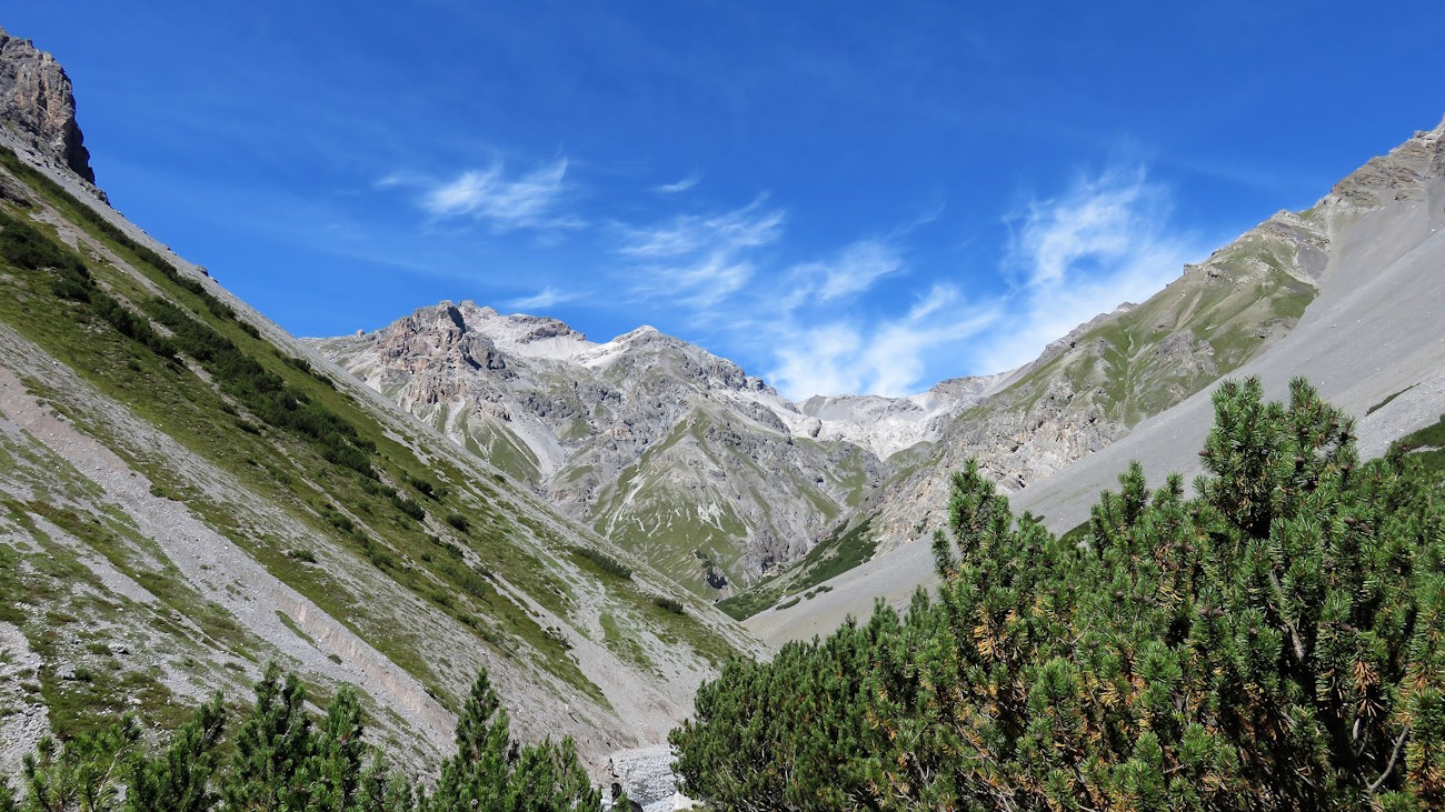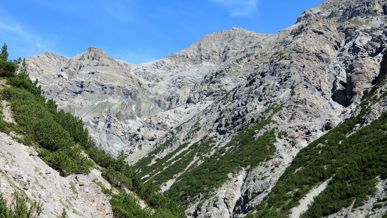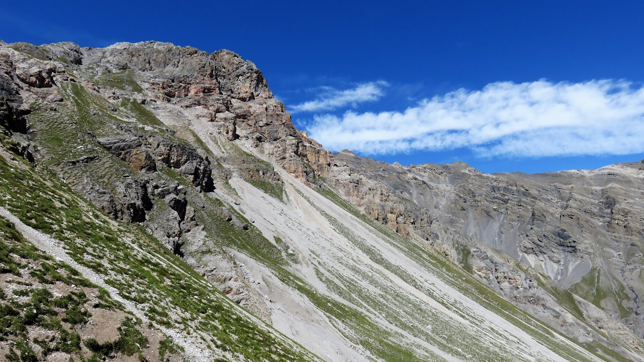 Ci voltiamo spesso indietro increduli del posto in cui ci troviamo. Qui non ci sono strade che salgono cosi come non ci sono rifugi o bivacchi. I monti e le rocce di queste zone sono molto particolari e diverse da tanti altri posti. Si notano chiaramente le numerose stratificazioni ad indicare le varie fasi di sedimentazione e gli immensi ghiaioni che scendono fino a valle. Sono perlopiù rocce marce e molto franose ma non per questo meno belle ed attraenti. Il paesaggio che modellano è veramente suggestivo. I sentieri che attraversano queste zone meritano di essere percorsi per assaporare la vera montagna, in molti tratti un po’ diversa dal solito, nonché per allontanarsi dal caos e dalla folla di Livigno (presa veramente d’assalto d’estate come d’inverno).