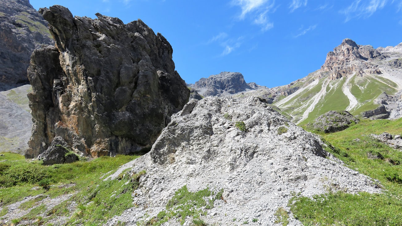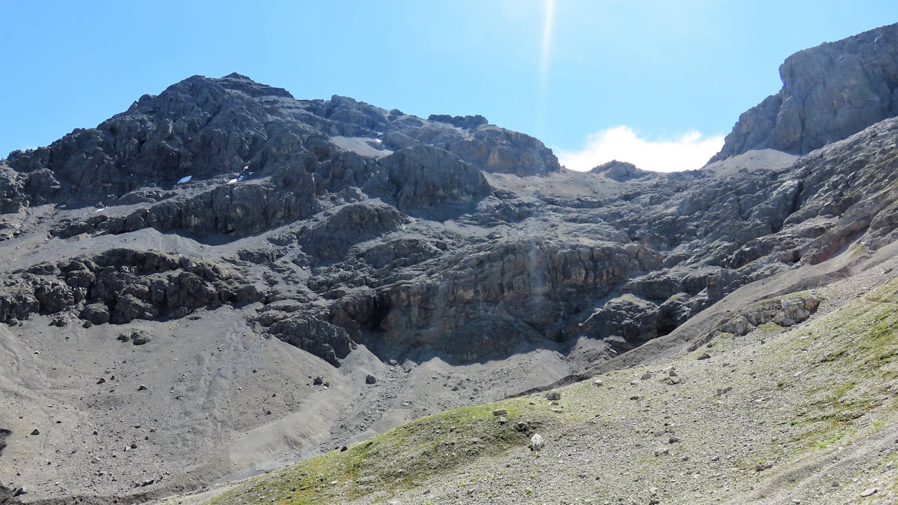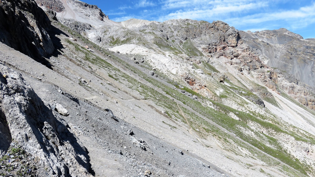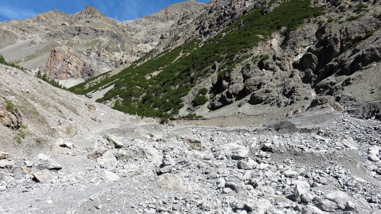 Superato questo punto, non brevissimo, risaliamo sul versante opposto della valle affrontando ancora una parte tranquilla di sentiero in mezzo ai mughi che poco oltre scompaiono lasciando campo libero alla ghiaia e sfasciumi. Tagliamo ancora un ghiaione e poi un altro ancora, in un paesaggio che ha già il sapore lunare. Qui è tutto franato e slavato; è impressionante notare quanto materiale terroso si sia staccato da questi versanti.