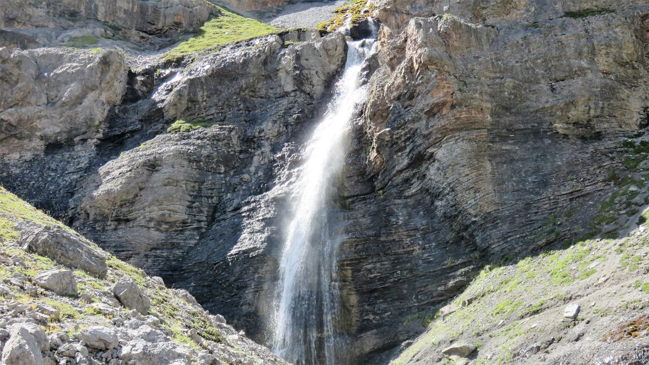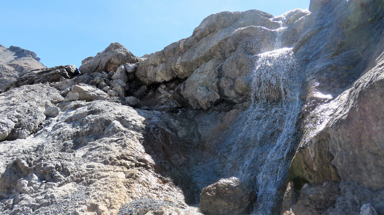 Dopo qualche metro si salita, però, ci si para davanti uno spettacolo magnifico e inaspettato. Il grigiore di questi versanti è infatti spaccato, o meglio squarciato, dall’azzurro-blu di una grande cascata, la cui sorgente si troverà nascosta in qualche punto sotto queste montagne, vai a sapere.
