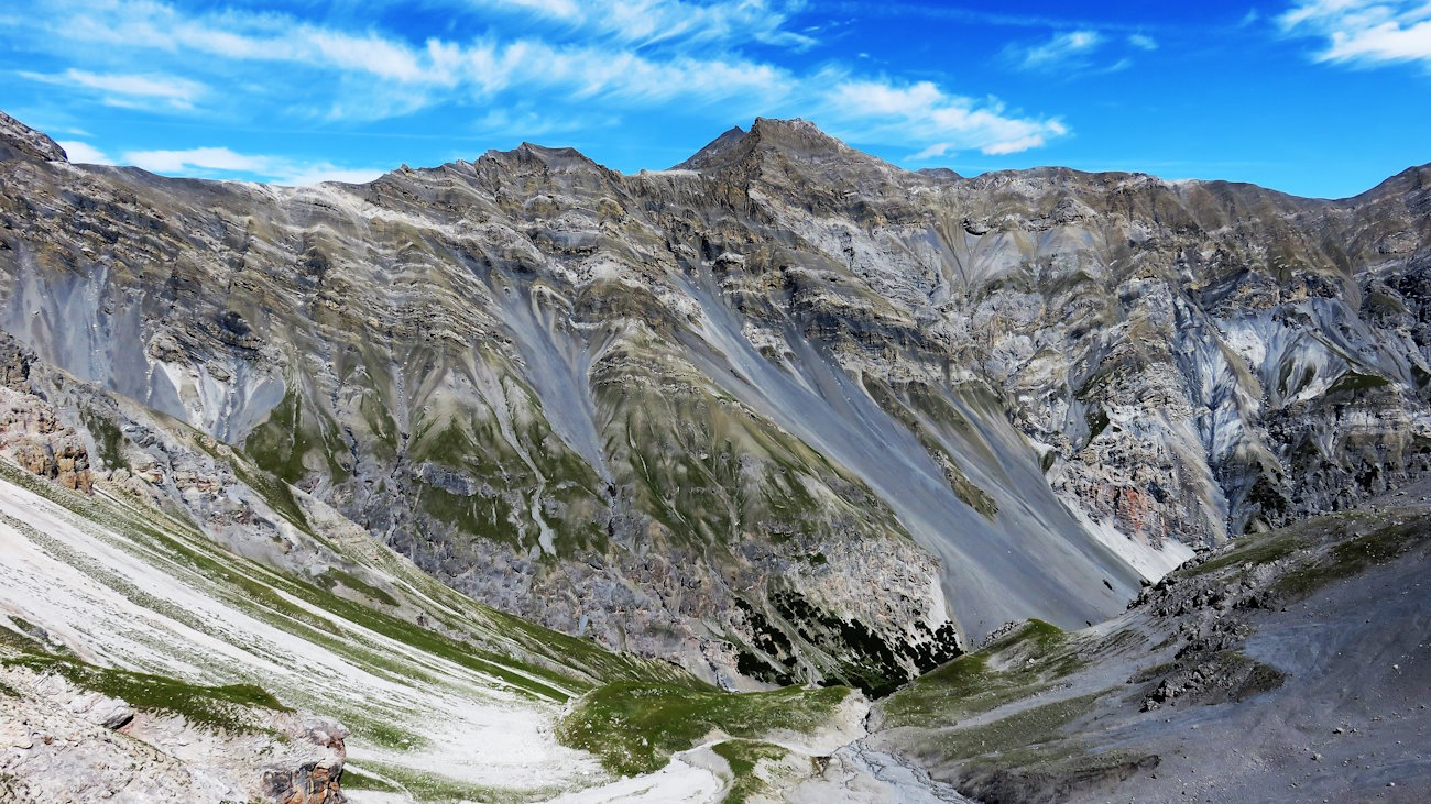 Voltandomi indietro scopro di trovarmi già davvero in alto. La cosa che mi colpisce di più, però, sono già le varie striature di queste rocce che formano la Valle Viera e la Val Cantone, davvero multicolori e lisce. Sotto di esse, immensi ghiaioni si alternano alla poca erba che ancora resiste e il tutto forma una composizione che nemmeno il genio più estroverso potrebbe partorire. Ma dove siamo finiti? E che incredibile luogo è questo?
