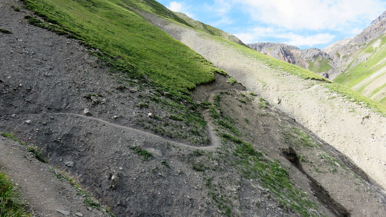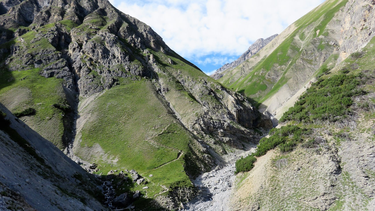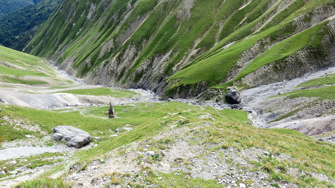 Mentre scendiamo sotto di noi (senza ali) vediamo quasi tutto il tortuosissimo tracciato da percorrere intagliato nei versanti della vallata che anche qui alterna prati e ghiaie. Ma quanta strada dovremo ancora fare!