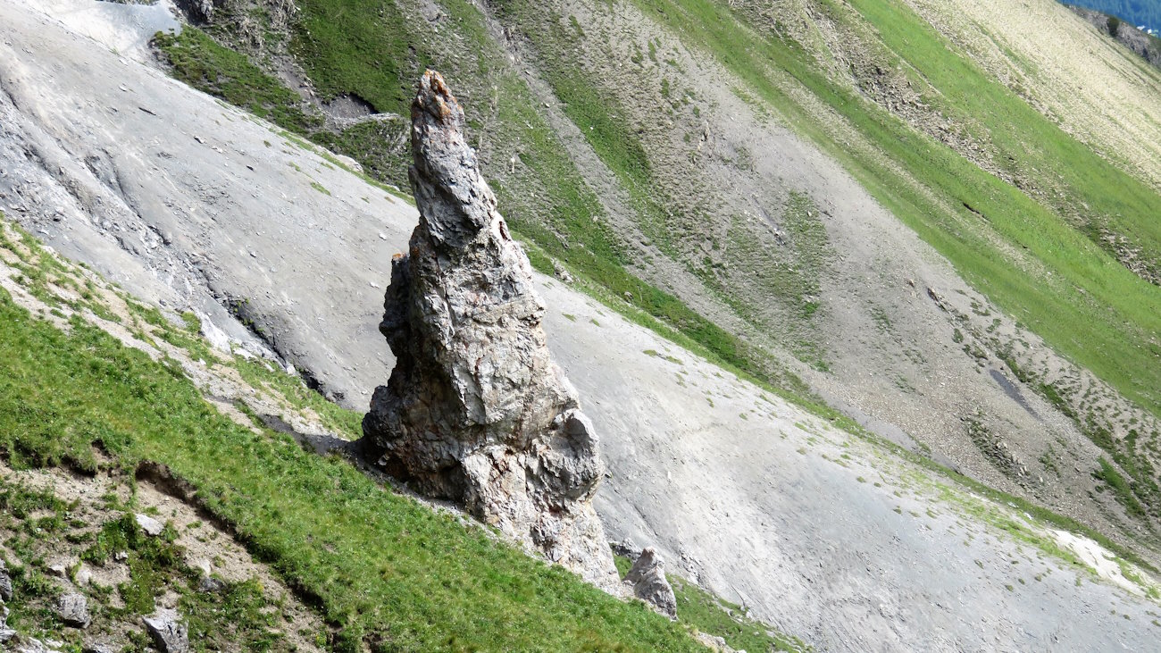 Passiamo di fianco una caratteristica guglia rocciosa come se ne trovano a centinaia sulle Grigne (Dolomiti, Grigne... ma quanta varietà esiste qui?) e scendiamo a zig-zag per un pendio erboso quasi verticale, che dall’alto fa quasi impressione. Laggiù, in basso, il Torrente della Valle del Saliente e l’incrocio di un altro sentiero che si perde verso ovest verso il Passo Tropione. Nel mezzo, come indicato sulla mia cartina (ma dove? Nell’acqua?) dovrebbe esserci il Baitel dala Sciascia ma anche questa struttura non sembra pervenuta. O è il sole che mi ha accecato o proprio non esiste.