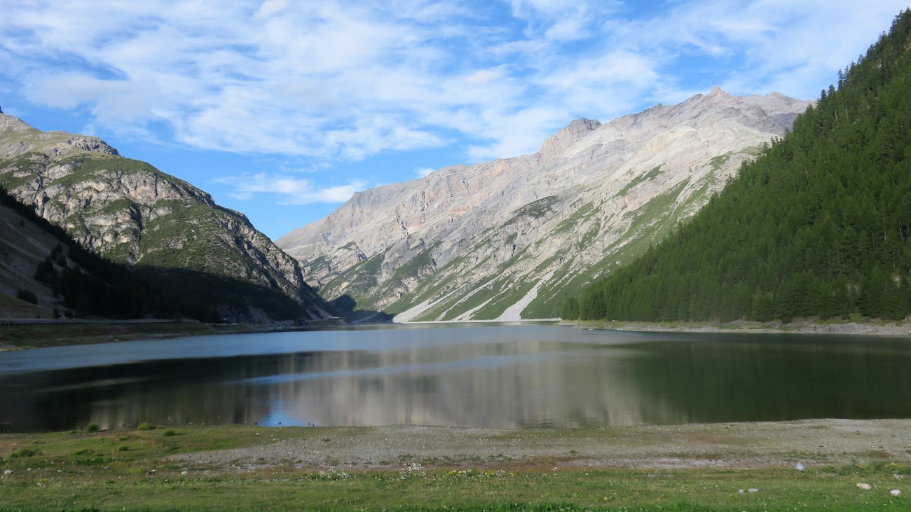 Attraversiamo la statale e incontriamo l’inizio della via con chiare indicazioni verso la Val Viera e il Mot (il Motto), una cima che domina il lago di Livigno. Iniziamo a camminare lungo un bel sentiero che in questa prima parte entra nel bosco e corre in piano e in parallelo al lago.