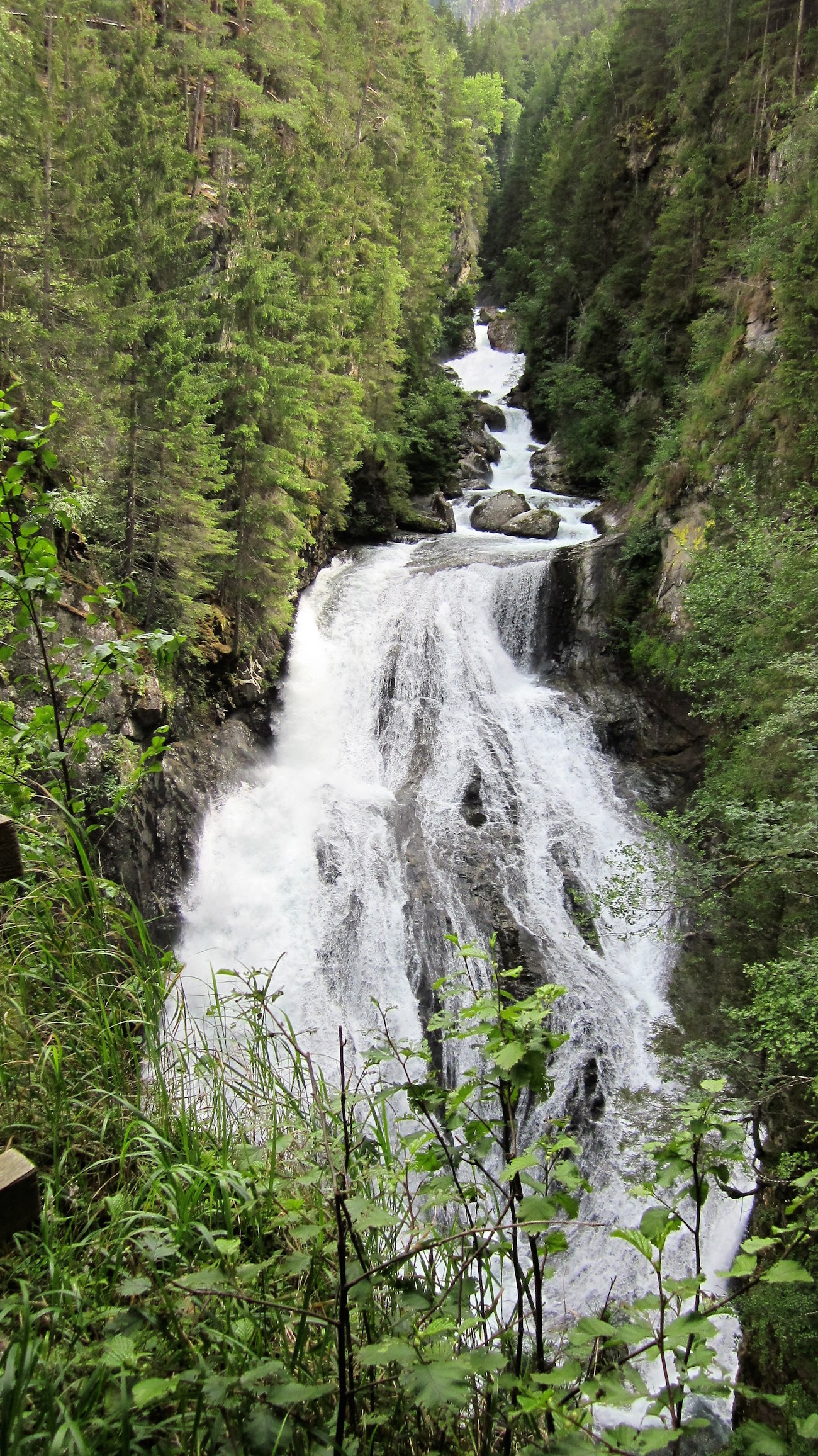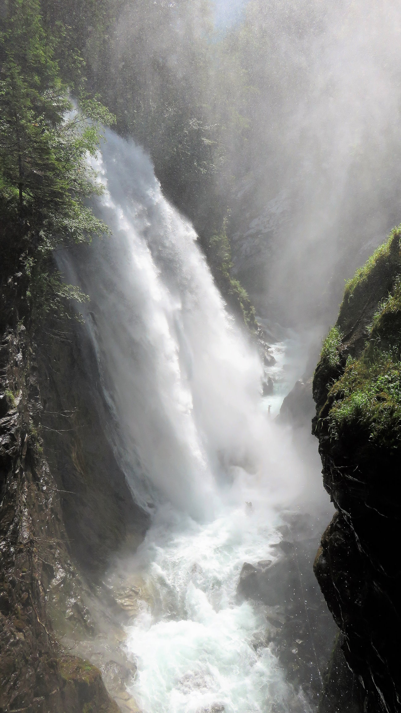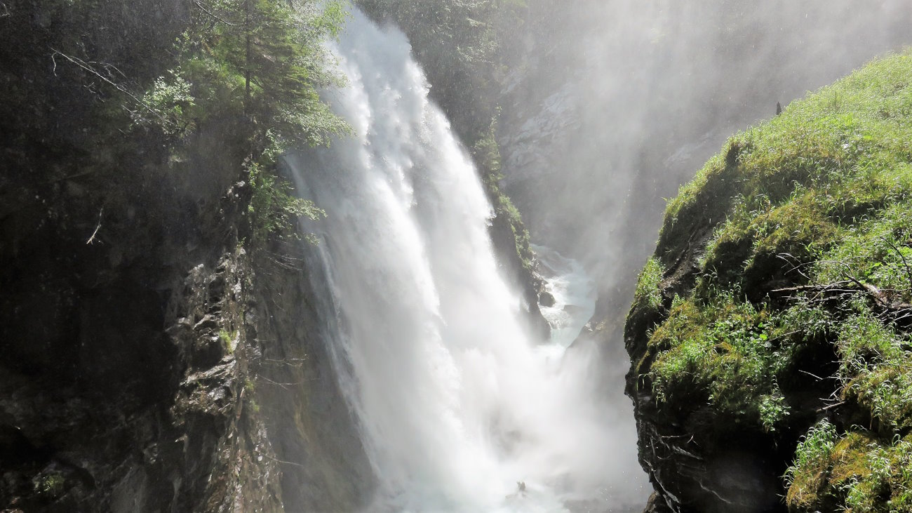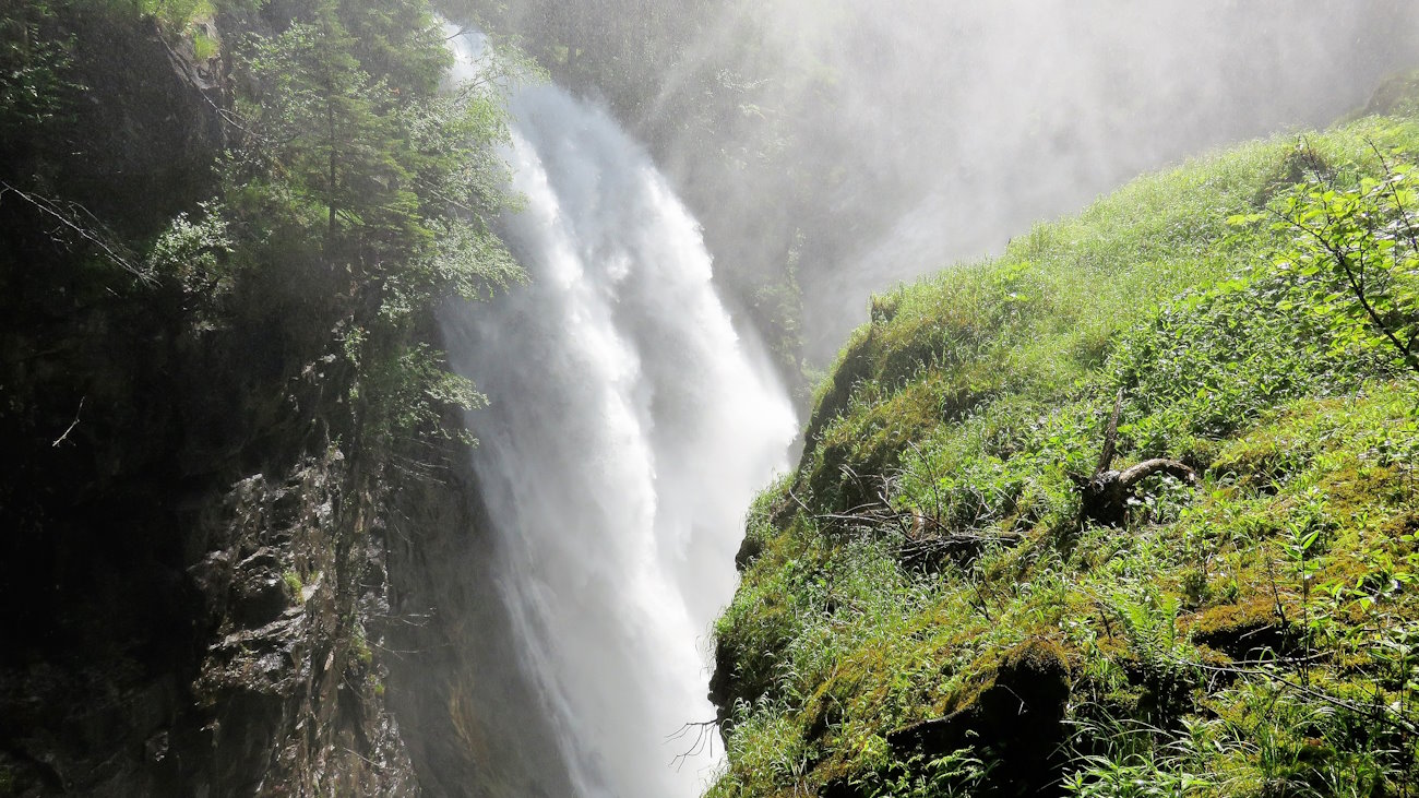 Per arrivare infine alla terza cascata, la più bella, alta ben 40 mt. percorro un sentiero in salita sempre nel bosco un po’ più ripido ma sicuro e dotato di corrimano. Dopo gli ultimi metri orizzontali e quasi pianeggianti, appare uno degli spettacoli naturali più incredibili. Questa terza cascata è immensa, di una potenza unica ed è una delle più alte di tutto l’Alto Adige. Gli spruzzi d’acqua giungono a me molto prima di arrivare a vederla e il vento provocato si fa sentire. Per ammirarla bene arrivo su un terrazzino di fronte alla stessa dove una bella doccia è assicurata.