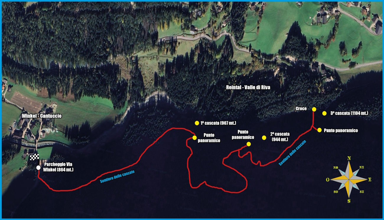 Dal parcheggio di Via Winkel (Winkel-Cantuccio, 864 mt.) si prende sulla sinistra il Sentiero delle Cascate, largo e comodo, e lo si segue fino ad arrivare ad un primo punto panoramico in prossimità della 1ª cascata (907 mt., 20’). Da qui si continua un po’ nel bosco in salita (Sentiero delle Scale) fino a giungere al secondo punto panoramico (2ª cascata, 904 mt., 40’). Infine, sempre seguendo l’unica traccia, si risale con più decisione il pendio fino a portarsi sul balcone panoramico di fronte la 3ª cascata (1104 mt., 20’). Nei pressi, un ponte permette più da vicino di vedere la massa d’acqua, nonchè di continuare il percorso in destra orografica del Torrente Riva, fino ad una croce. Il ritorno avviene per la via di salita fino al parcheggio (2h 30’).