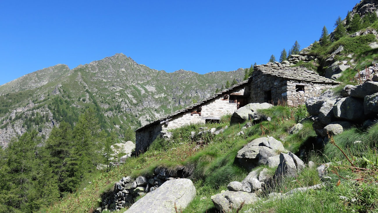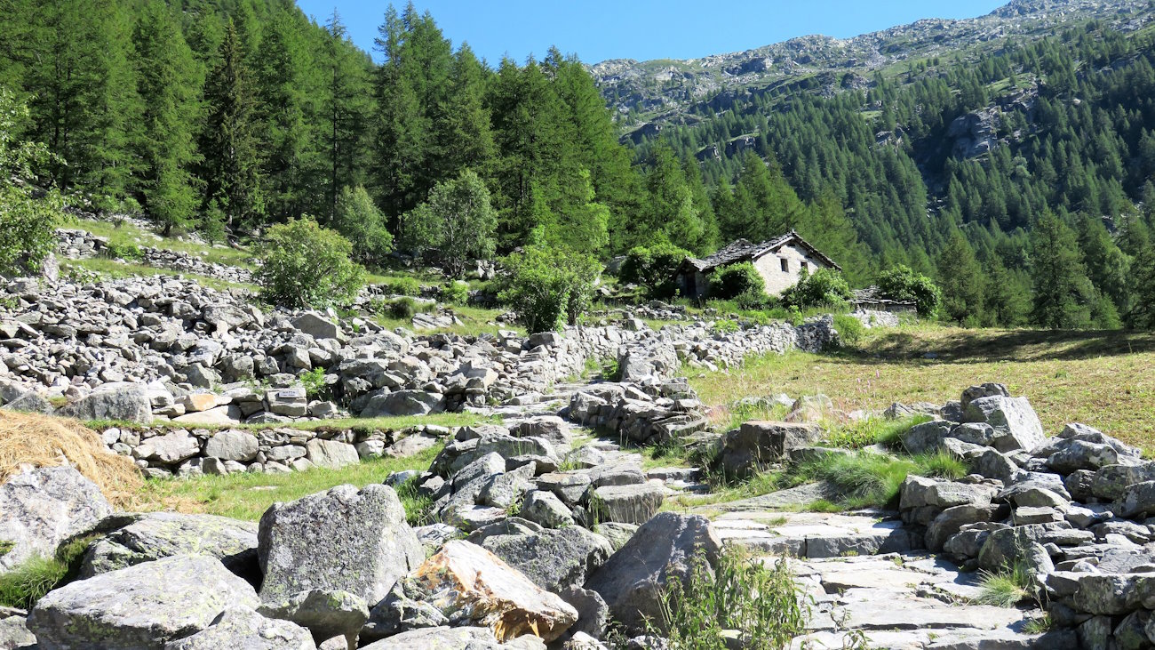 Mi incammino su una bella stradina tutta lastricata di ciottoli e gradinata che è proprio un gioiellino e che passa proprio sul retro della Gruba, in direzione di qualche alpe superiore. Man mano che salgo cammino accanto a diverse costruzioni in pietra (alcune semidistrutte) adagiate in un bel pianoro verdeggiante. Prima è la volta di Peiri, quattro casupole in croce, poi di Matta e Stubin dove molti edifici sono ormai collassati e invasi dalla vegetazione alta.