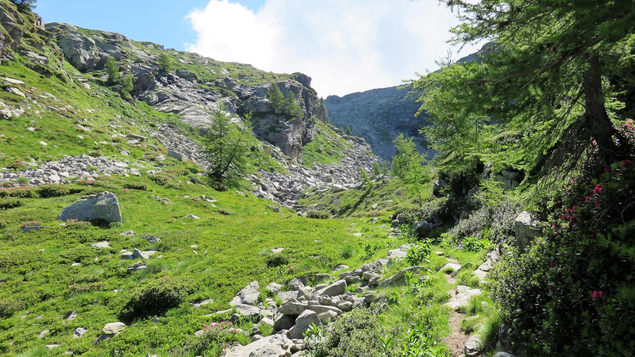 Tra enormi macigni granitici, radici e una bella fioritura di rododendri supero un primo strappo ritrovandomi alla destra di un’altra baita abbandonata. Ancora pochi metri e mi ritrovo in una gola strana, fatta di roccia, erba e bassa vegetazione: il Pitout Lazouney.
