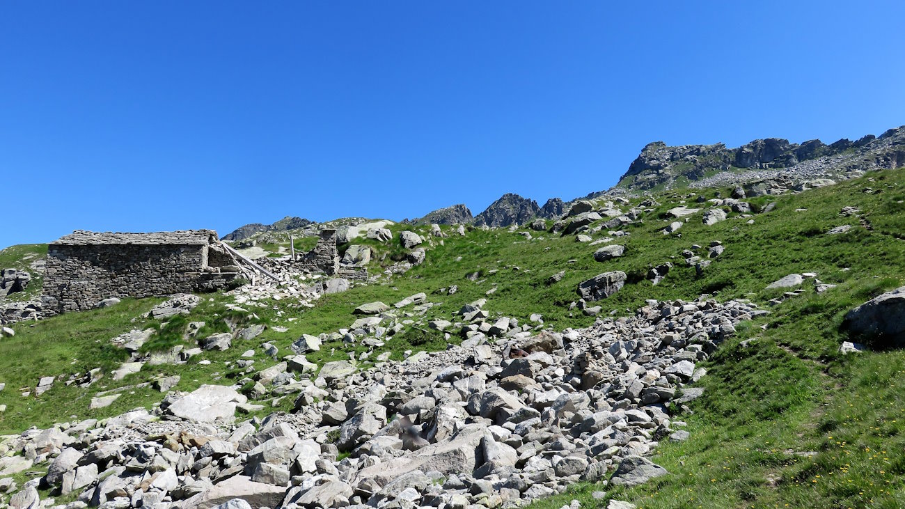 La zona è anche un po’ fangosa con la vegetazione spesso alta in alcuni punti. Mi fermo un attimo per guardarmi intorno ma da qui non ho ancora un bel panorama. In compenso alcune di queste baite in pietra sono evidentemente state da non molto recuperate. La loro perfezione e pulizia, i muri in pietra e i tetti in piode (lastre sottili di gneiss o scisto) le rendono uniche, un capolavoro. Il tutto cozza un po’ con l’abbandono dei terreni che le circonda, non più monticati credo. Almeno, io oggi non vedo bestiame o pastori.