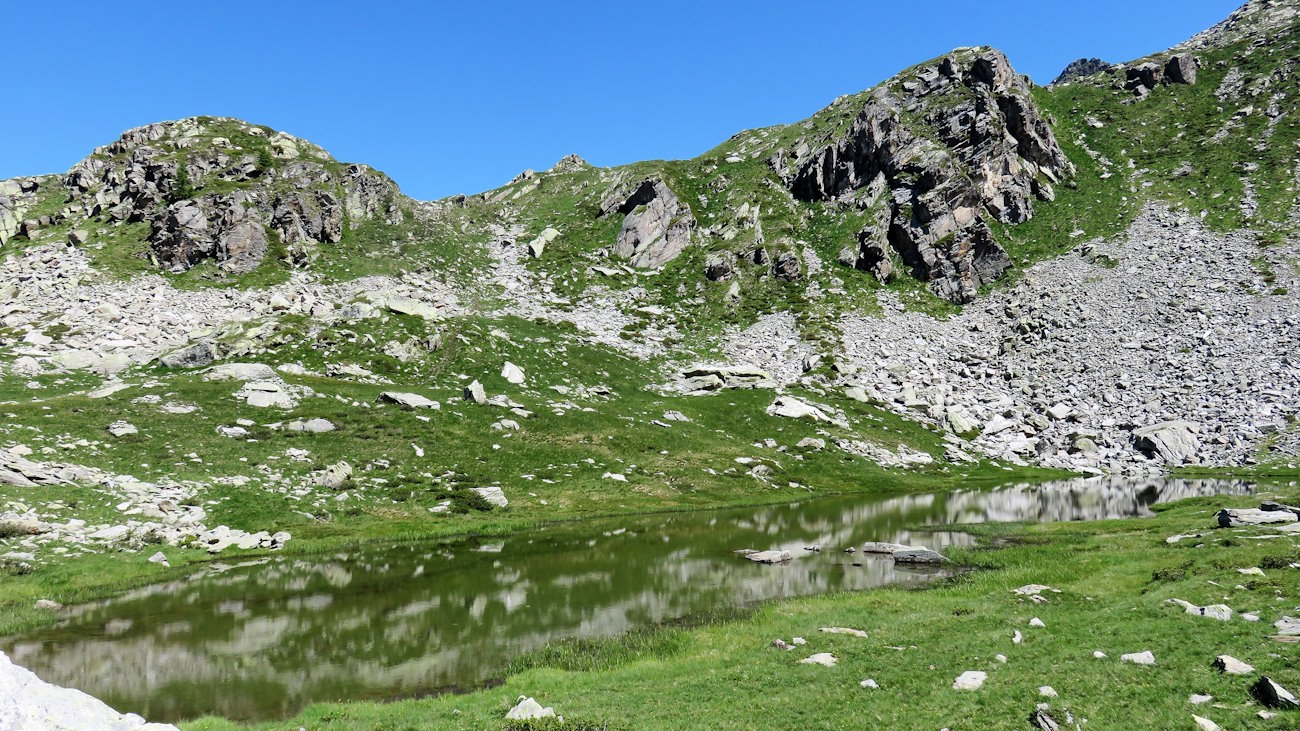 Compaiono invece le prime due anime del giorno, una coppia intenta a giungere anch’essa alla Mologna Grande. Arrivo così, abbastanza improvvisamente, in un pianoro verde meraviglioso, direttamente sulla sponda del piccolo laghetto di Grekij dove nelle sue acque si riflettono questi pendii di erba e pietre. È questa una piccola e splendida conca, sconosciuta ai più, isolata e davvero unica. La meta finale potrebbe essere benissimo questa, dove sedersi su qualche pietra e prendere il sole (ricordatevi però poi di restituirlo!) consumando un bel picnic, lontano da tutto e da tutti. Soli, con l’alta montagna. Favoloso!
