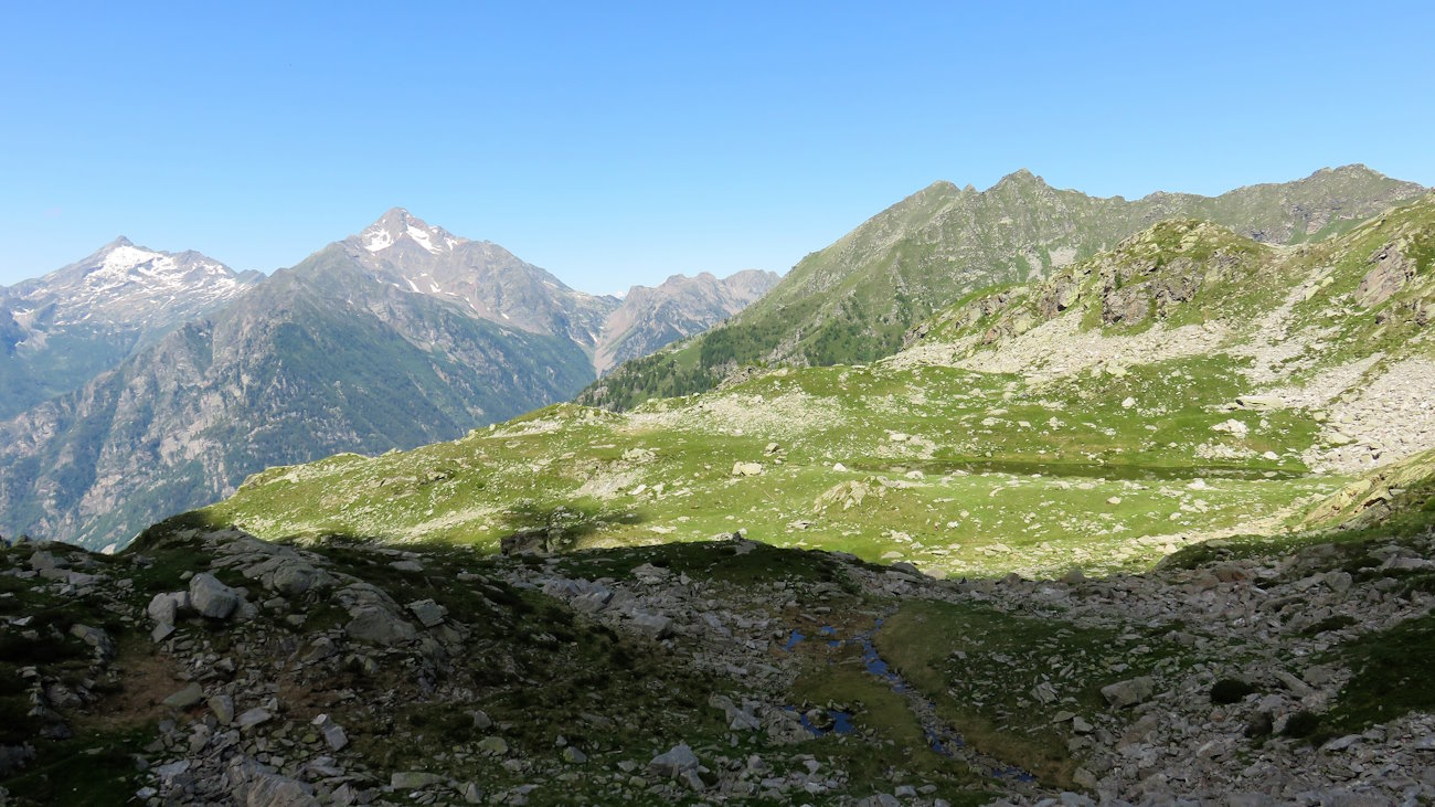 È una posizione strana questa, non aerea come mi sarei aspettato similmente ad una forcella di questo tipo. Sul versante piemontese opposto non vi è discesa diretta ma un bel pianoro chiuso da una catena di cime che si affacciano su Alagna. Che luogo remoto e solitario! Difficile incontrare qualcuno, a meno che non si capiti proprio nel periodo di passaggio del Tor des Géants!