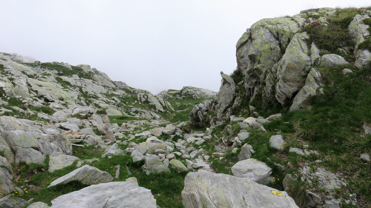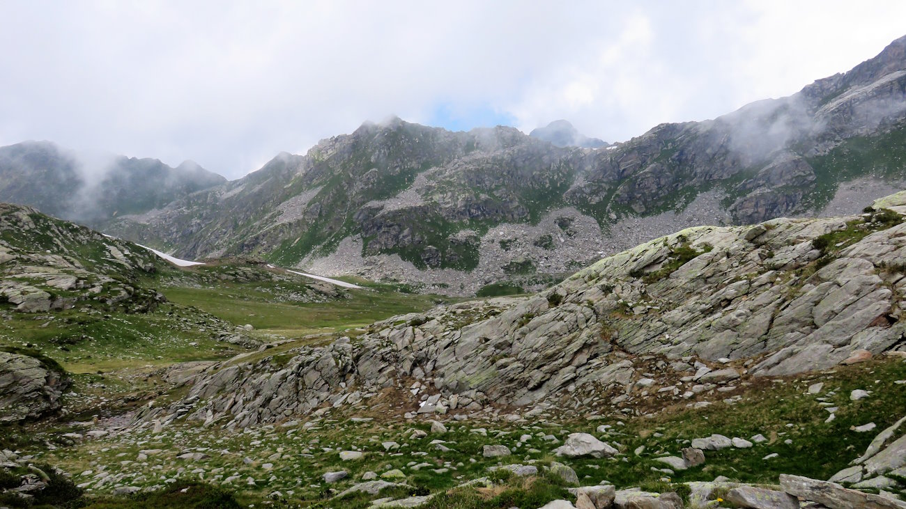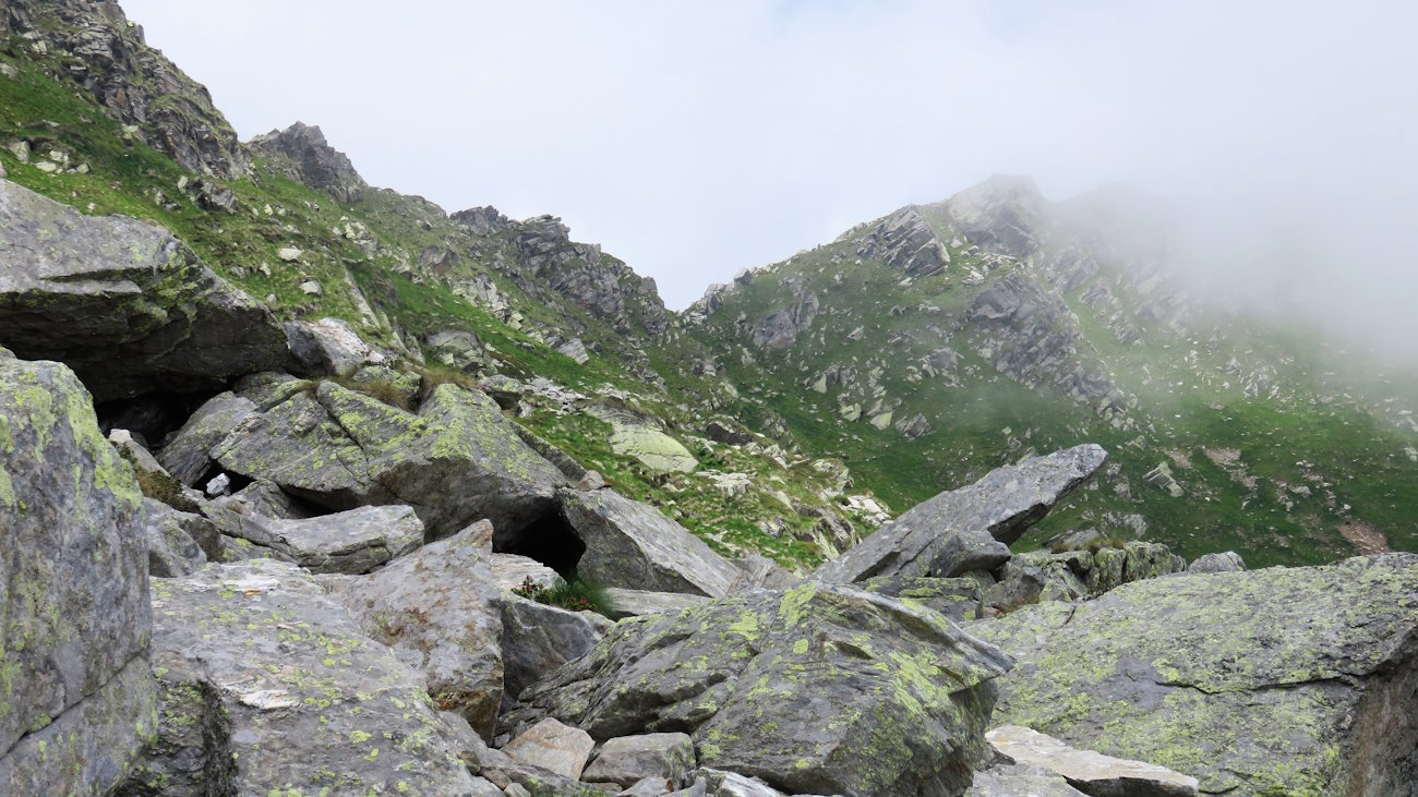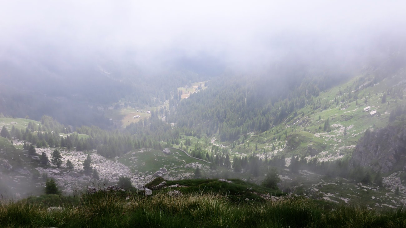 Così procedo ma quando giungo di nuovo alla Mologna Grande scopro che le nubi hanno invaso per metà anche la Valle d’Aosta. Che sfortuna! La visuale non è comunque tanto brutta come poco fa e, dunque, dopo essermi riportato al grande ometto di pietra sotto il valico, imbocco il sentiero che, senza perdere quota, mi porterà ad un altro colle, quello di Lazouney. Di scendere per la via di salita non ne ho proprio voglia e questo anello indicato sulla mappa dovrebbe essere fattibile.