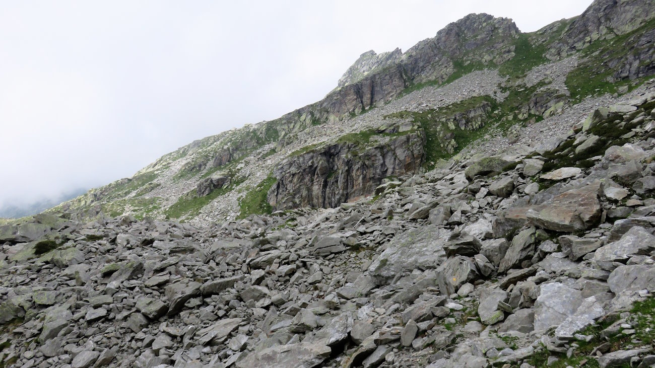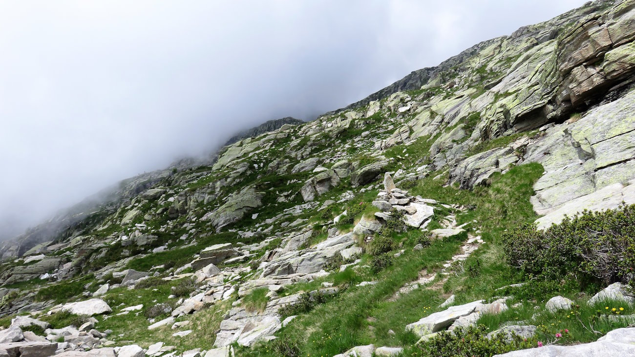 La traversata in quota fino al nuovo colle non dovrebbe richiedere più di un’oretta. Il sentiero è ben definito e piuttosto agevole, salvo alcuni punti dove devo scavalcare o aggirare grosse pietraie. I cari, fidati, ometti sono anche in questo caso un faro illuminante.