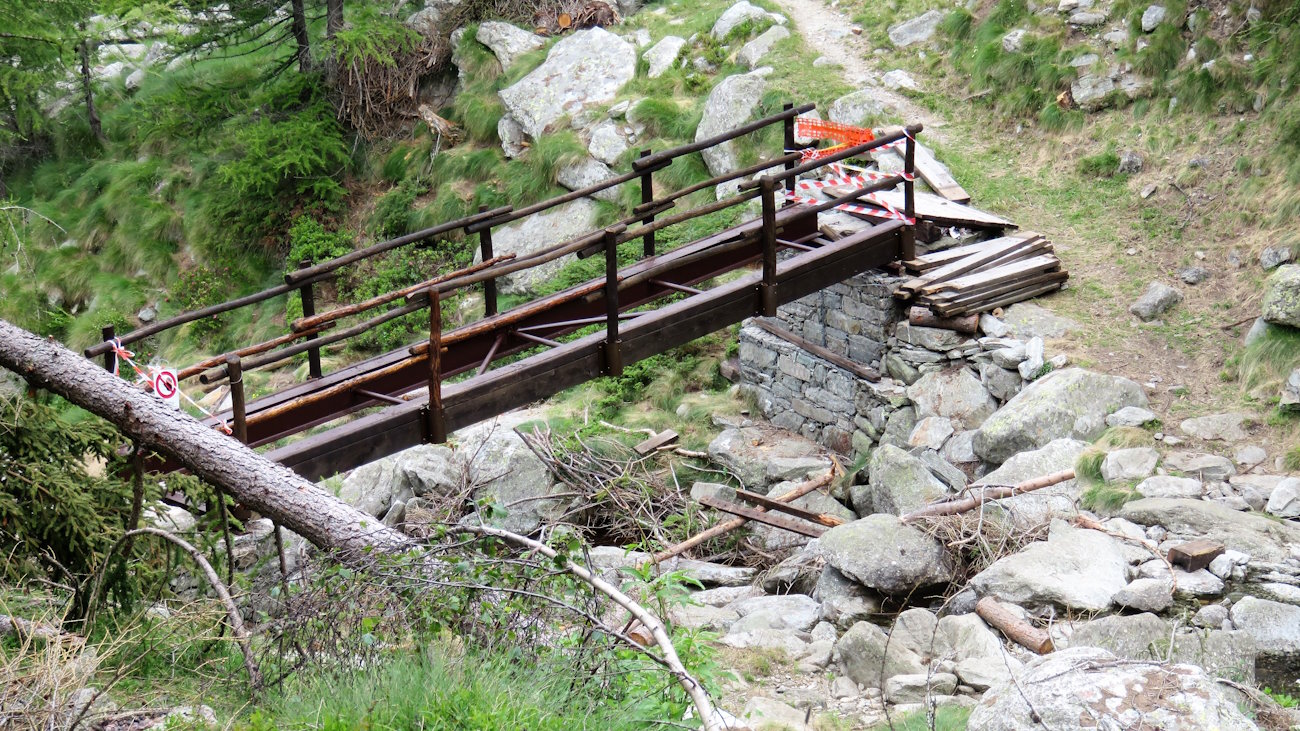 Risalgo lentamente in questa grande piana ma in fondo, oltre gli alberi, vedo già il pendio farsi più severo. Dopo Stubin la pendenza aumenta un po’ e il sentiero sale dritto per un bel prato in direzione nord-est, fino a giungere ad una specie di ponte o di passerella. No, decisamente mi pare più un ponte, solo che in questo momento manca il tavolato sul quale si cammina e sono rimasti solo gli infissi! Chiaramente la struttura è chiusa; manca solo un bel cartello con scritto “stiamo lavorando per voi”!