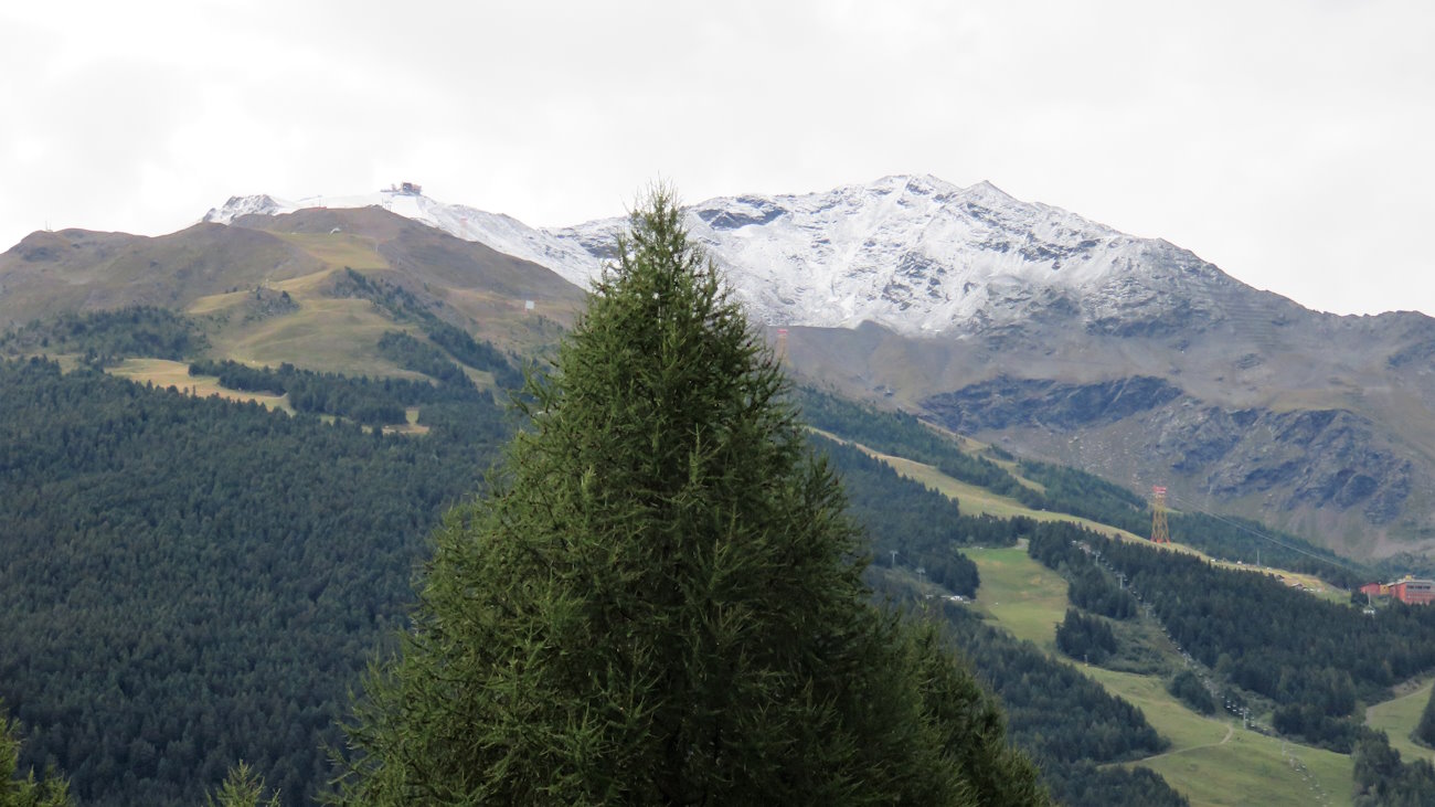 La pista abbandona quasi subito l’asfalto per entrare in un bel bosco misto. Cammino molto agevolmente e con una pendenza non troppo sostenuta. Mi bastano pochi passi per avere una visuale molto bella su Bormio e sulle cime imbiancate all’orizzonte. Già, mentre nei precedenti giorni a Bormio pioveva, lassù nevicava. Che spettacolo e che contrasto di colori! Caspita, non ho fatto che poca strada e sono già a contemplare una visuale su Bormio insolita e aerea; davvero bello!