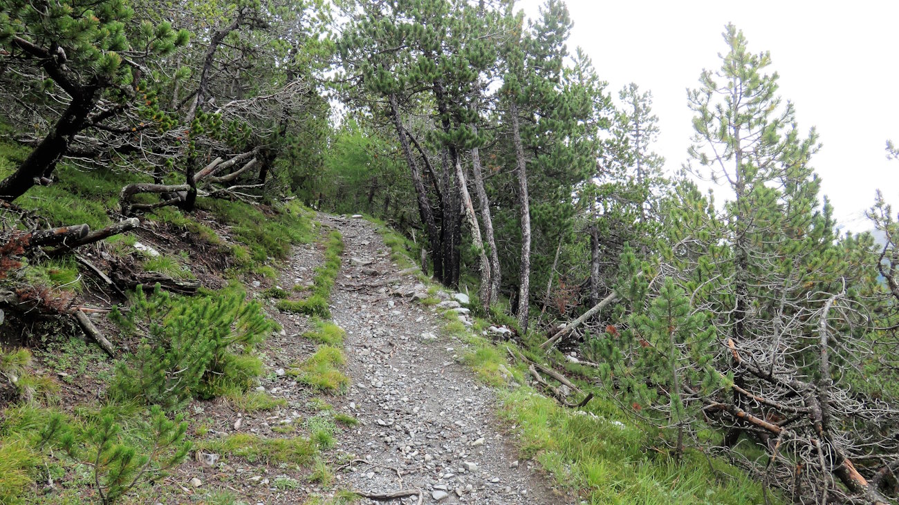 Il sentierino sale sempre abbastanza ripido ma costante nel bellissimo bosco di larici. È caratterizzato da una serie infinita di tornanti lungo i quali si trova ogni volta il rispettivo numero, indicante proprio quanti ancora di questi mancano fino alla meta. Meglio non farci caso perché saranno davvero un’enormità!