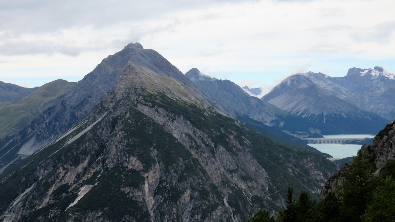 Un ultimo cartello in legno, nei pressi del quale un sentierino si stacca sulla sinistra, precede il mio arrivo alla Croce della Reit che domina la conca di Bormio. La vegetazione qui lascia scorgere un panorama incredibile. Iniziando da destra vi è la Valdidentro dove subito rimango colpito dalla Valle di Fraele coi laghi di Cancano, San Giacomo e il Monte delle Scale, inconfondibile con la sua grande croce bianca posta sulla cima. Con lo zoom della fotocamera vedo anche che c’è gente sul pianoro sommitale! Più lontano è anche chiaramente visibile l’imbocco del Passo del Foscagno e della Val Viola.