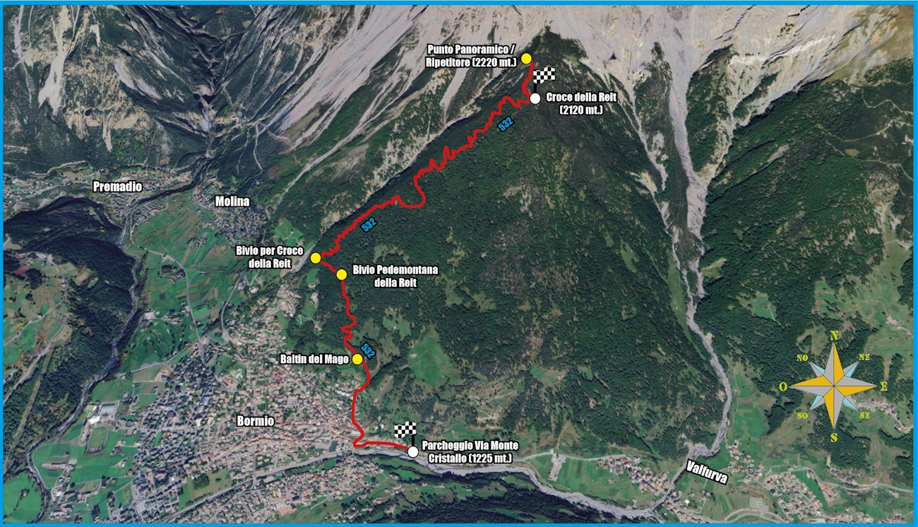 Tappe del percorso: Parcheggio Via Monte Cristallo (Bormio) - Via Guardia Nazionale - Via Castello - Via Ca’ Bianca - Baitin del Mago - Bivio Pedemontana della Reit - Bivio Croce della Reit - Croce della Reit - Punto panoramico/ripetitore - Croce della Reit - Bivio Croce della Reit - Bivio Pedemontana della Reit - Baitin del Mago - Via Ca’ Bianca - Via Castello - Via Guardia Nazionale - Parcheggio Via Monte Cristallo (Bormio)