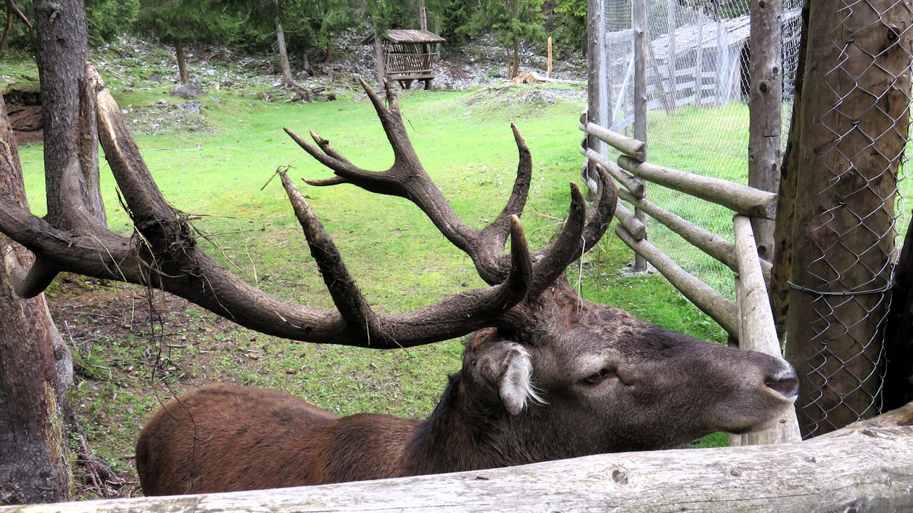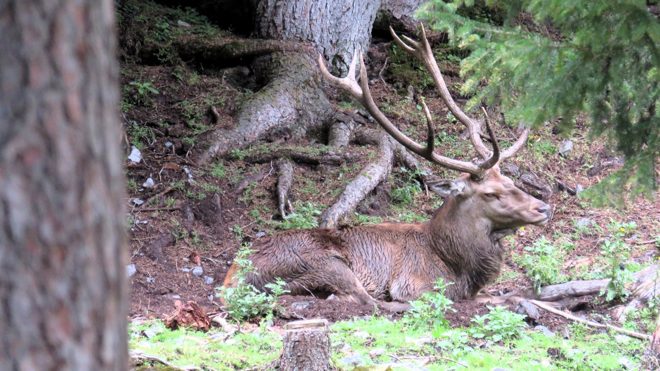 I primi passi mi conducono in una bella pineta ma nemmeno il tempo di prendere il ritmo che sento un lungo bramito alle mie spalle. Ma questo è un cervo! Infatti, eccolo, lo vedo dietro di me. Anzi li vedo, dato che in una porzione di bosco recintata (una specie di area faunistica) una coppia si avvicina per salutarmi! La femmina in particolare deve essere curiosa e si porta lentamente alla recinzione, verso di me. È tenerissima e con un palco di corna enormi. Pronti-via e dunque mi ritrovo già fermo. Come non passare del tempo con queste splendide creature? Passa quasi un’ora e sono ancora in compagnia dei cervi. A malincuore li devo però salutare se voglio affrontare il tragitto odierno.