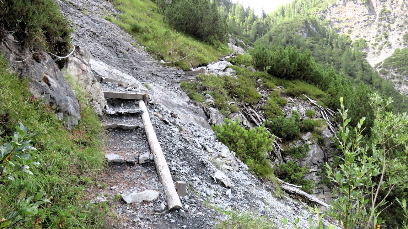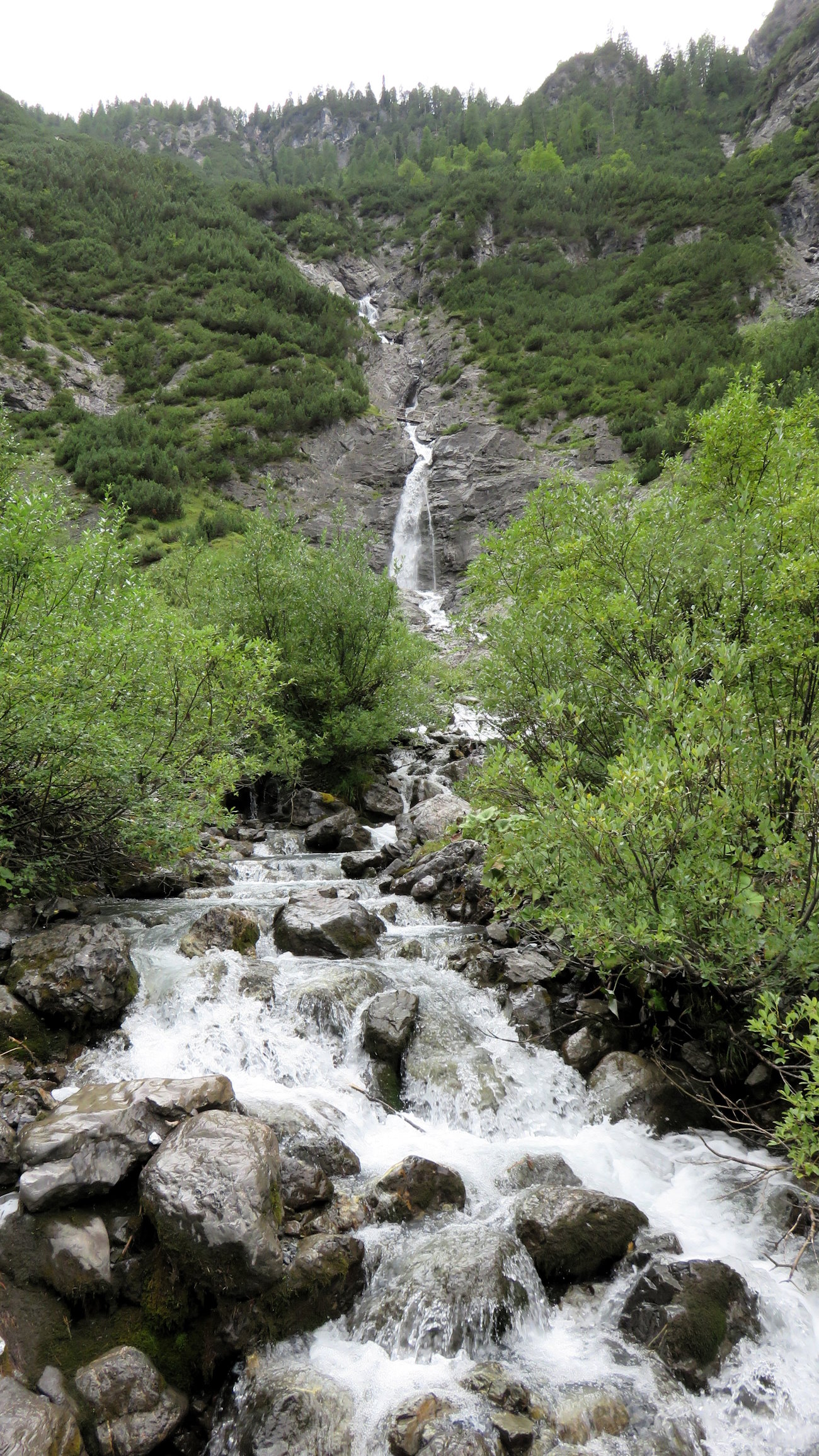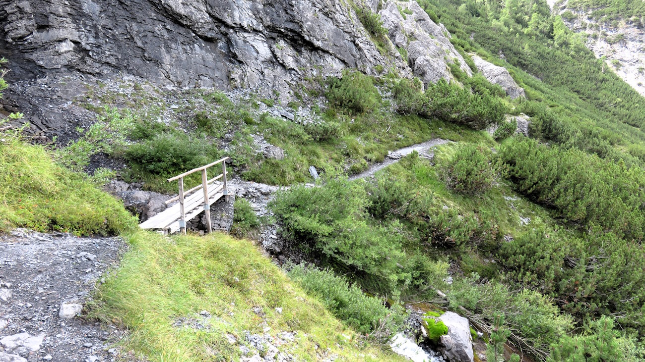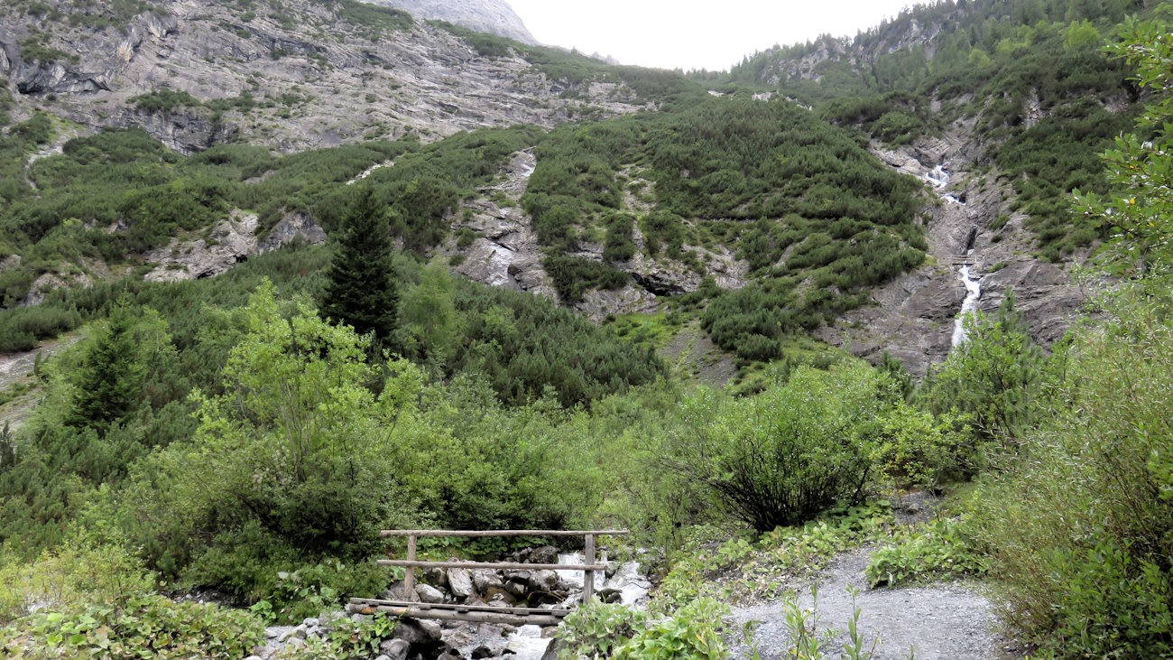 Insisto tagliando già un grande ghiaione sul quale, superando ogni legge della fisica, un’infinita varietà di arbusti si tengono attaccati con tutte le loro forze. Una cascata è già in vista, spero di passarci vicino! Di fronte a me rocce ovunque e spaccature profonde nella roccia caratterizzano il versante nord del gruppo dell’Ortles. Le pulsazioni crescono e la curiosità aumenta ad ogni passo. Gioia pura! Poco oltre giungo proprio a ciò che speravo. Un primo ponticello di legno oltrepassa il Rio Trafoi ma la cosa bella è che al di sopra di esso, in un punto più alto e contro le rocce, ne vedo un altro! Wooow!! Ponti e passerelle a go-go! Altro che percorsi avventura, se non lo è questa! E, oltretutto, con uno sviluppo molto più tranquillo!