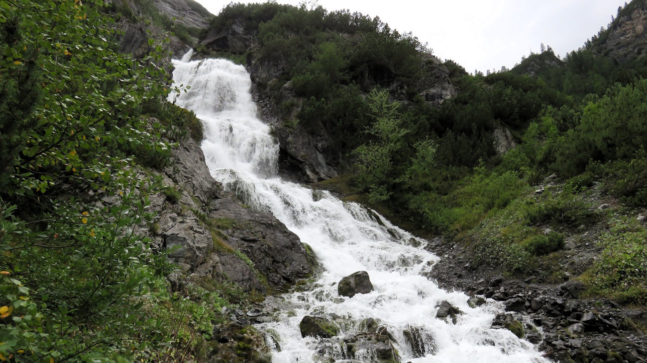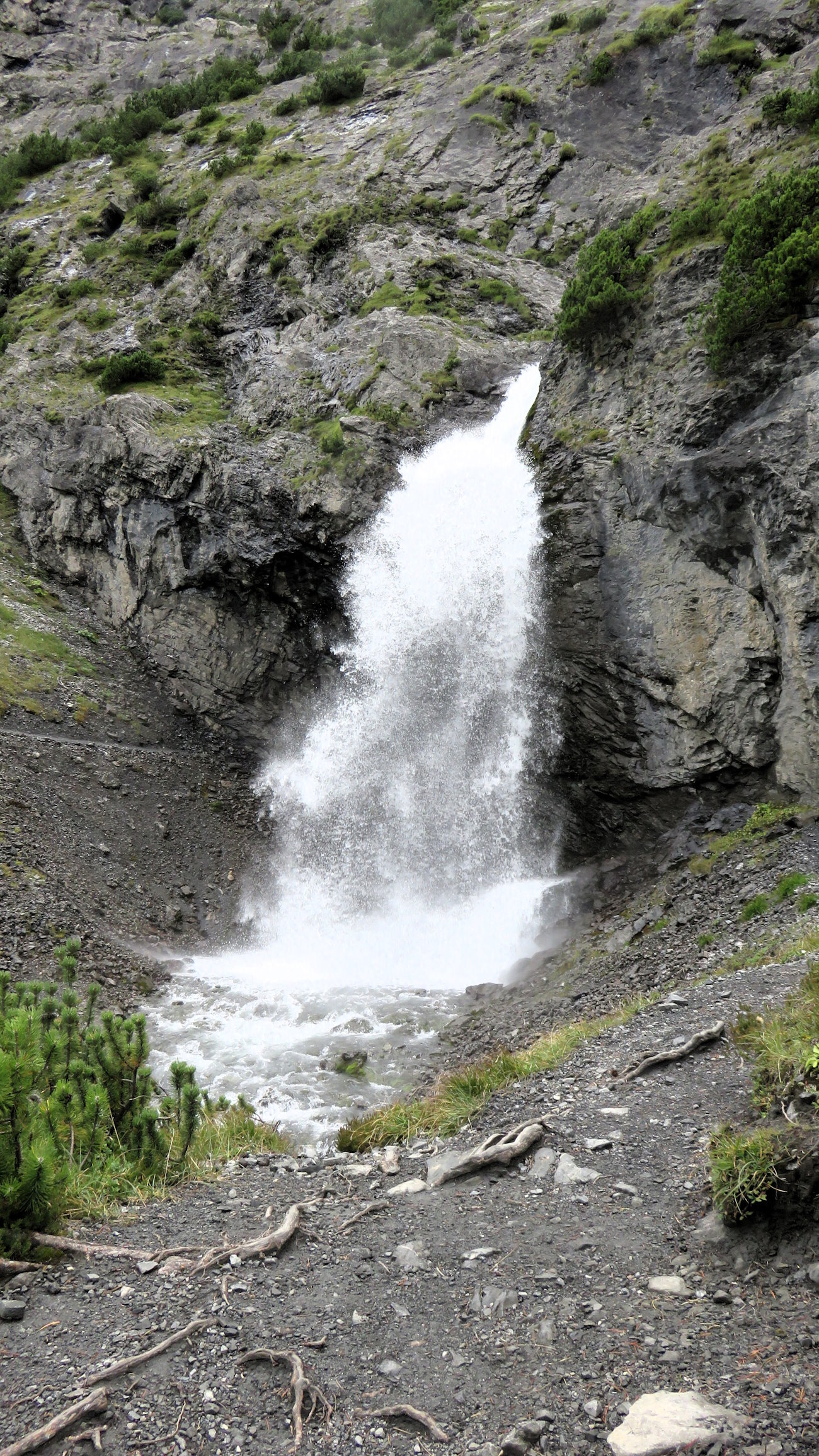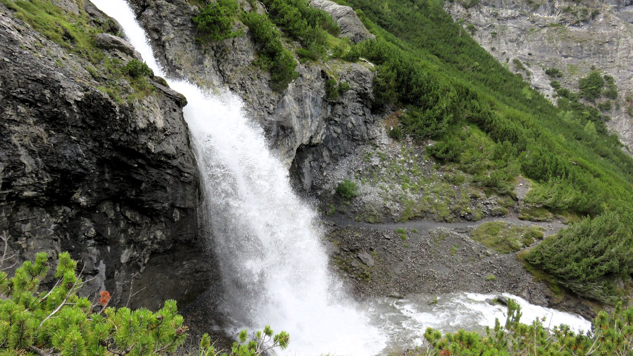 Muovo lentamente i primi passi in direzione delle cascate che scendono da una parete immensa, verticale, della quale nemmeno vedo la fine. Mi sento così minuscolo, anzi lillipuziano, sotto giganti di roccia che incombono sulla mia testa. Tutto attorno a me sembra davvero impressionante e subito il cuore inizia a battere freneticamente. Al confine tra media e alta montagna, vedo canaloni in cui l’acqua scroscia impetuosa, isole di arbusti e pini mughi aggrappati alla roccia, ghiaioni enormi da attraversare e ancora altri muri d’acqua che sembrano proprio sgorgare dal nulla, sotto la montagna.