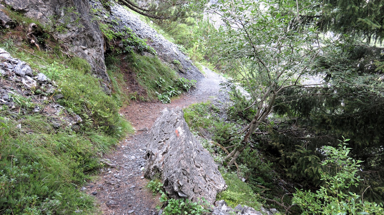 Dopo aver percorso una prima parte pianeggiante, tra ghiaia e radici nel bosco, giungo improvvisamente ad un bivio. Punto gli occhi verso l’alto, verso gli arbusti, i mughi e le rocce e, più o meno, ne intravedo lo sviluppo. Così, su due piedi, mi sembra meglio affrontarlo in senso orario, e così procedo. C’è un rumore già assordante di acqua intorno a me, sono circondato da un paesaggio che sembra di essere su di un altro pianeta! Che cartolina!