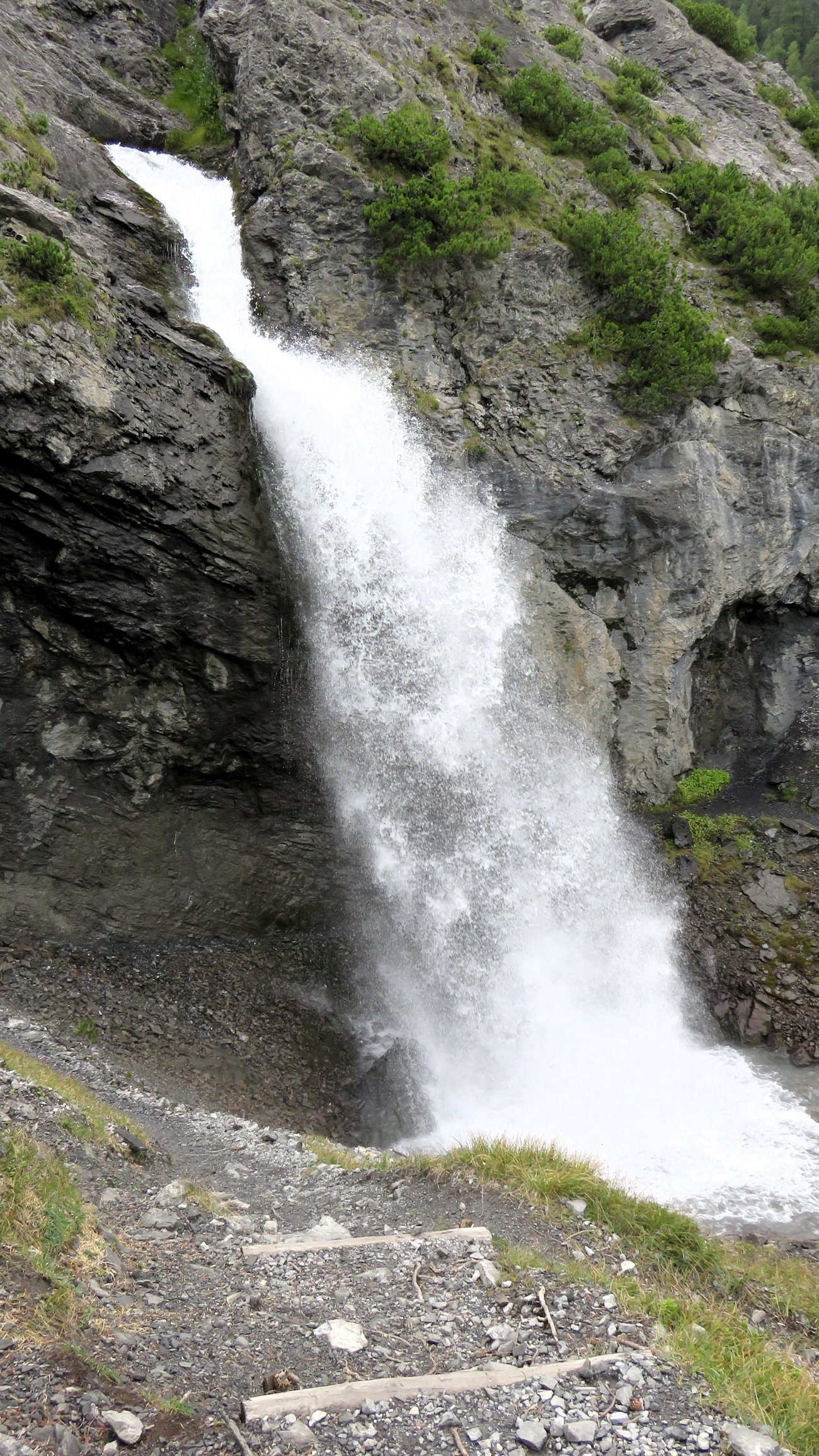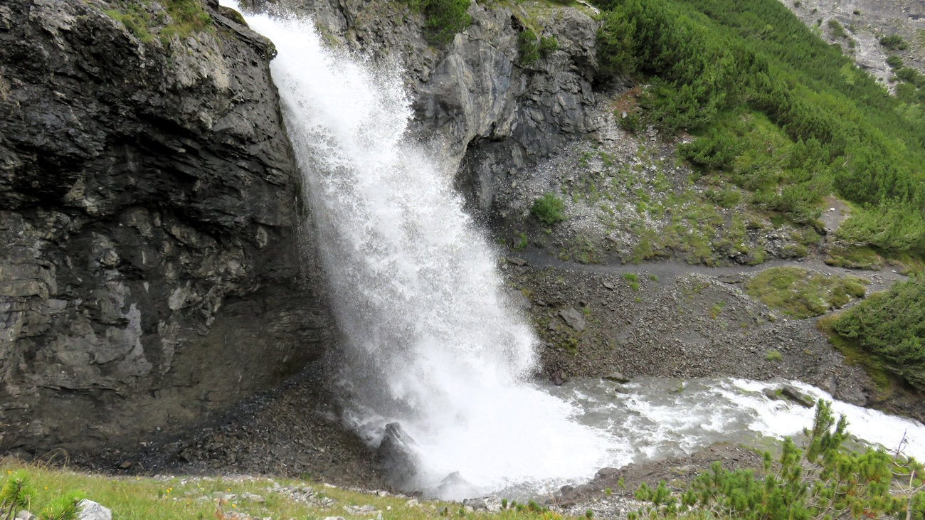 Quando credo non ci siano più sorprese, ecco giungere l’apoteosi e la protagonista principale di questo giro. La grande cascata! Appare proprio di fronte a me, non appena oltrepasso una curva che è anche il principale punto panoramico (e punto più elevato) del tragitto. Da qui si vede tutta (o quasi) la Valle di Trafoi dove in primo piano appare il Kleinboden (Campo Piccolo), un montucolo e una postazione difensiva austriaca durante la Grande Guerra. Il sole illumina questa montagna creando riflessi bellissimi. Laggiù verdi prati, qui il regno delle rocce. La cascata è enorme, gigantesca! Una massa d’acqua impressionante si riversa a valle con una furia mai vista. Il mio sorriso, se possibile, si è talmente allargato che neanche quello del famoso Stregatto di Alice nel Paese delle Meraviglie!! Resto così, a bocca aperta, per non so quanto tempo. Poi, ai primi spruzzi sul volto, mi riprendo deciso a proseguire. “Sì, ma dove passare?” mi domando. Guardo in basso e in alto. Nulla. Possibile?