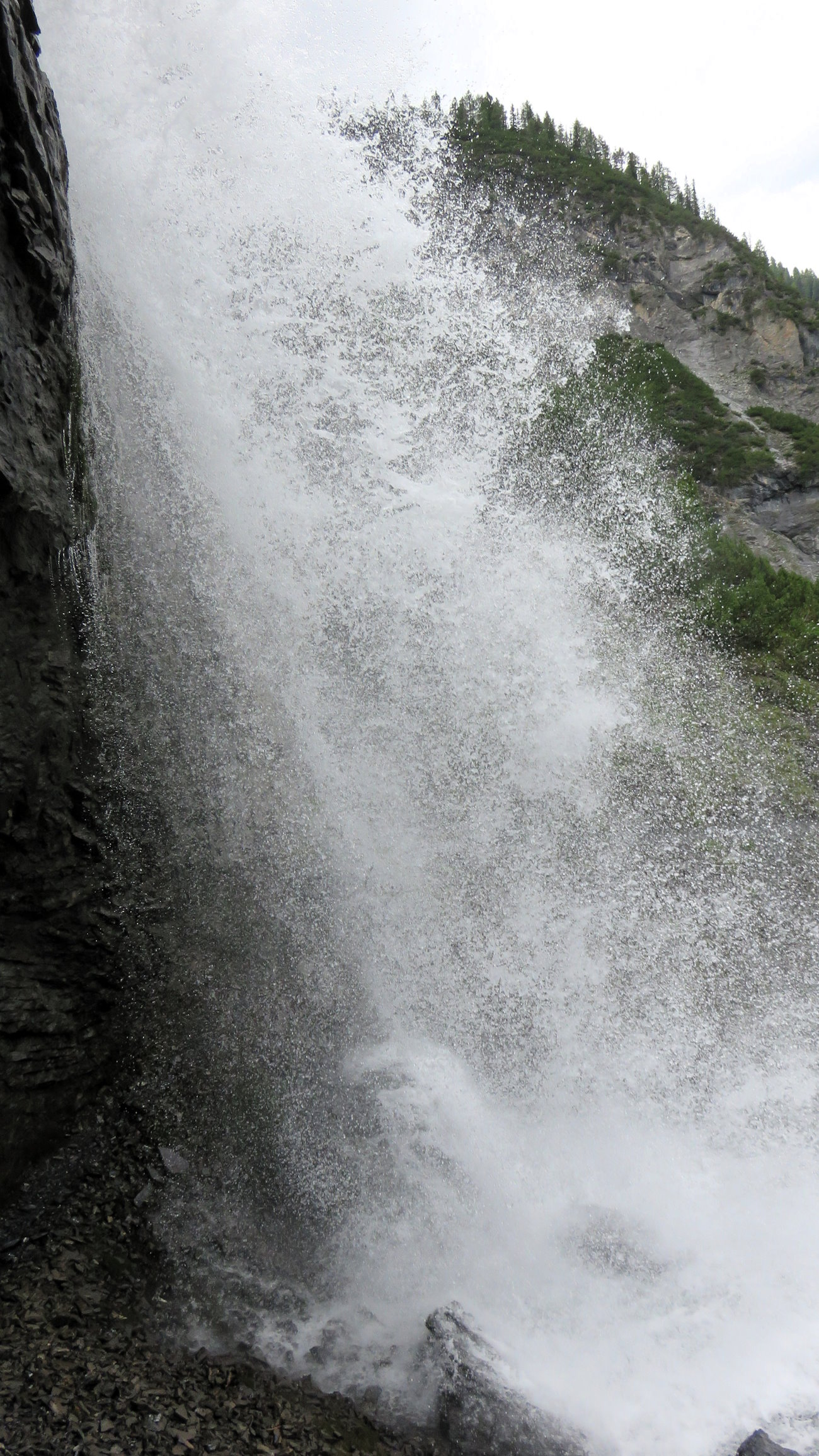 Dopo un po’ mi butto, letteralmente. Con un altro urlo, di slancio, passo sotto e dietro al muro d’acqua, uscendone piuttosto zuppo! Ma che cosa è stato questo momento! Il passaggio mi ha ricordato il sentiero attrezzato fatto qualche anno or sono nel Fanes, sulle Dolomiti. Ma lì si è un po’ più protetti e forse la massa d’acqua un po’ minore...