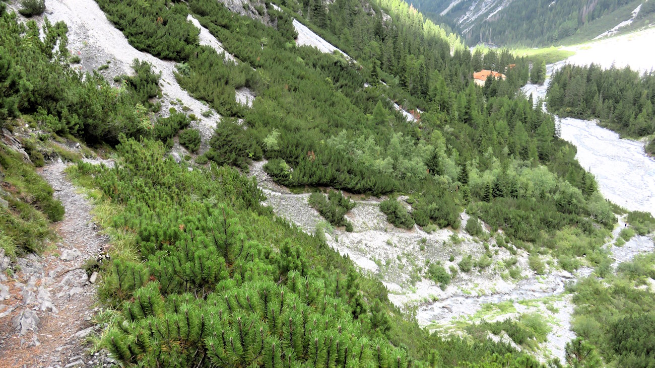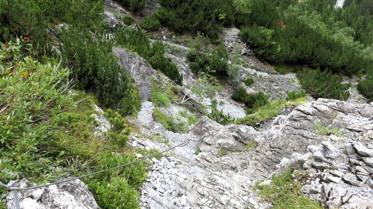 Oltre la cascata il sentiero inizia a scendere per chiudere l’anello più in basso. L’ambiente cambia ancora: le rocce lasciano nuovamente il posto alla vegetazione, in questo caso un mare di mughi tra i quali il sentiero si infila sinuoso. Ve l’ho detto, ogni metro qui è una sorpresa. Non ultima quella che mi spetta ora, ossia tre brevi salti di roccia da superare usando le mani e tenendosi al cavo metallico qui posto. I punti incriminati non pongono alcuna difficoltà, se non, appunto, il mettere le mani e magari il sedere sulle rocce.