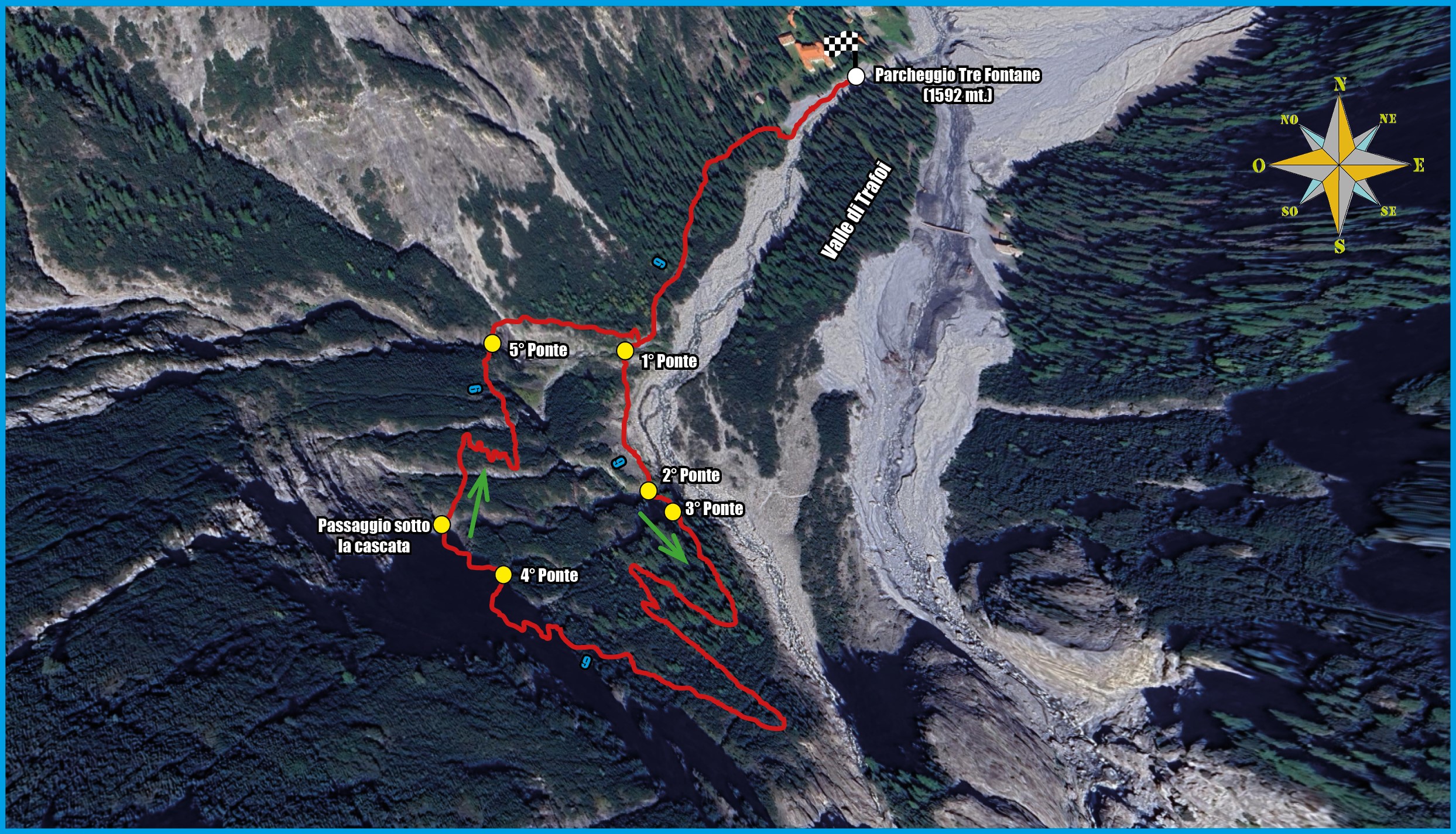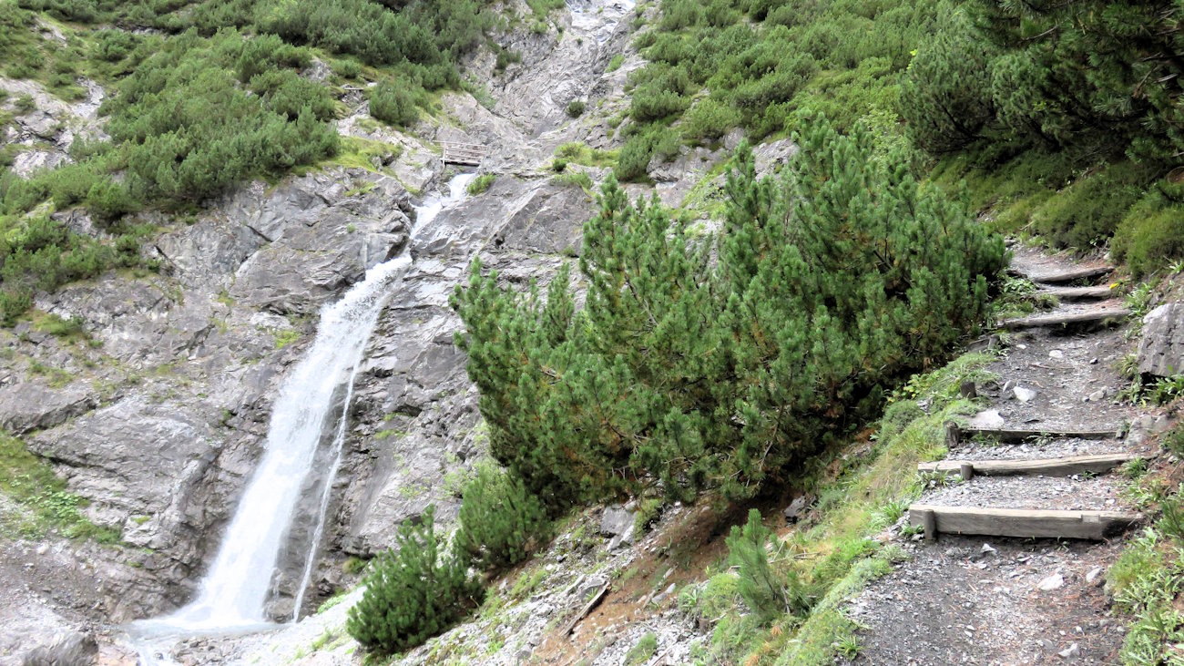 Dal parcheggio Tre Fontane nell’Alta Valle di Trafoi (1592 mt.) si tralascia sulla sinistra il grande ponte sul Rio Trafoi col sentiero che porta al Rifugio Borletti per proseguire dritto, verso sud-ovest, fino al termine dell’area di sosta. Qui parte la traccia n°9 in direzione della cascate che scendono dal Madaccio di Fuori (gruppo Ortles). Oltrepassata un’area faunistica, il sentiero costeggia nel bosco il Rio Trafoi fino ad un bivio. Tralasciando la traccia sulla destra, dalla quale si rientrerà, si continua verso sinistra per un tratto in piano. Si superano, in sequenza, un primo, un secondo e un terzo ponte, finché il sentiero prende decisamente a salire e, dopo quattro tornanti e altrettante rampe, giunge nella parte alta sotto le cascate. La traccia subito si restringe e si fa un po’ esposta; grandi gradoni sistemati nel terreno agevolano la progressione. Oltre questo punto, un breve tratto attrezzato anticipa il passaggio su di un quarto ponticello in legno. Poi, poco dopo, si incontra un punto panoramico (1778 mt.) e il famoso passaggio sotto la cascata principale che scende dalla montagna. Subito oltre, inizia la discesa. Il sentiero serpeggia dapprima tra i mughi per superare più avanti un salto di roccia (cavo metallico). Si oltrepassa quindi un quinto ponticello e si affronta poco oltre un secondo tratto attrezzato in un punto scosceso del pendio. Un altro comodo tratto scalinato conduce, infine, al bivio incontrato in precedenza. Al ricongiungimento, non resta che tornare sui propri passi al parcheggio.