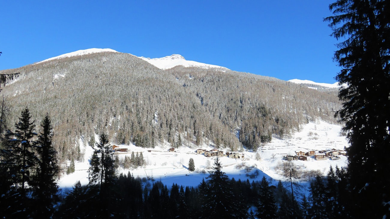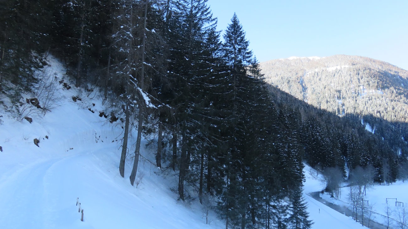 Sui pendii opposti della valle di Rabbi il sole splende e arriva ad illuminare le frazioni di Somrabbi e Serra. Che contrasto e che differenza di temperature! Secondo me gli abitanti dei borghi assolati soprastanti sono intenti in questo momento a farsi un bagno in piscina mentre quelli della frazione sita nel fondovalle, al gelo e in ombra, si stanno cimentando nella costruzione di pupazzi di neve e igloo...