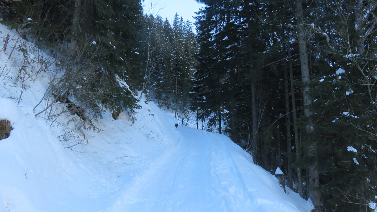 Scendo dall’auto in ombra, in una fredda mattina di febbraio (-9°C) e tutto l’asfalto del parcheggio è cosparso di ghiaccio. Senza ramponcini mi tocca fare le evoluzioni per rimanere in piedi: inizio un ballo interminabile che dura fino al momento di agganciare le ciaspole. Tuttavia, è ancora presto per incominciare la giornata e così decido di camminare lungo la statale verso valle per vedere se almeno trovo un piccolo bar in cui fare colazione.