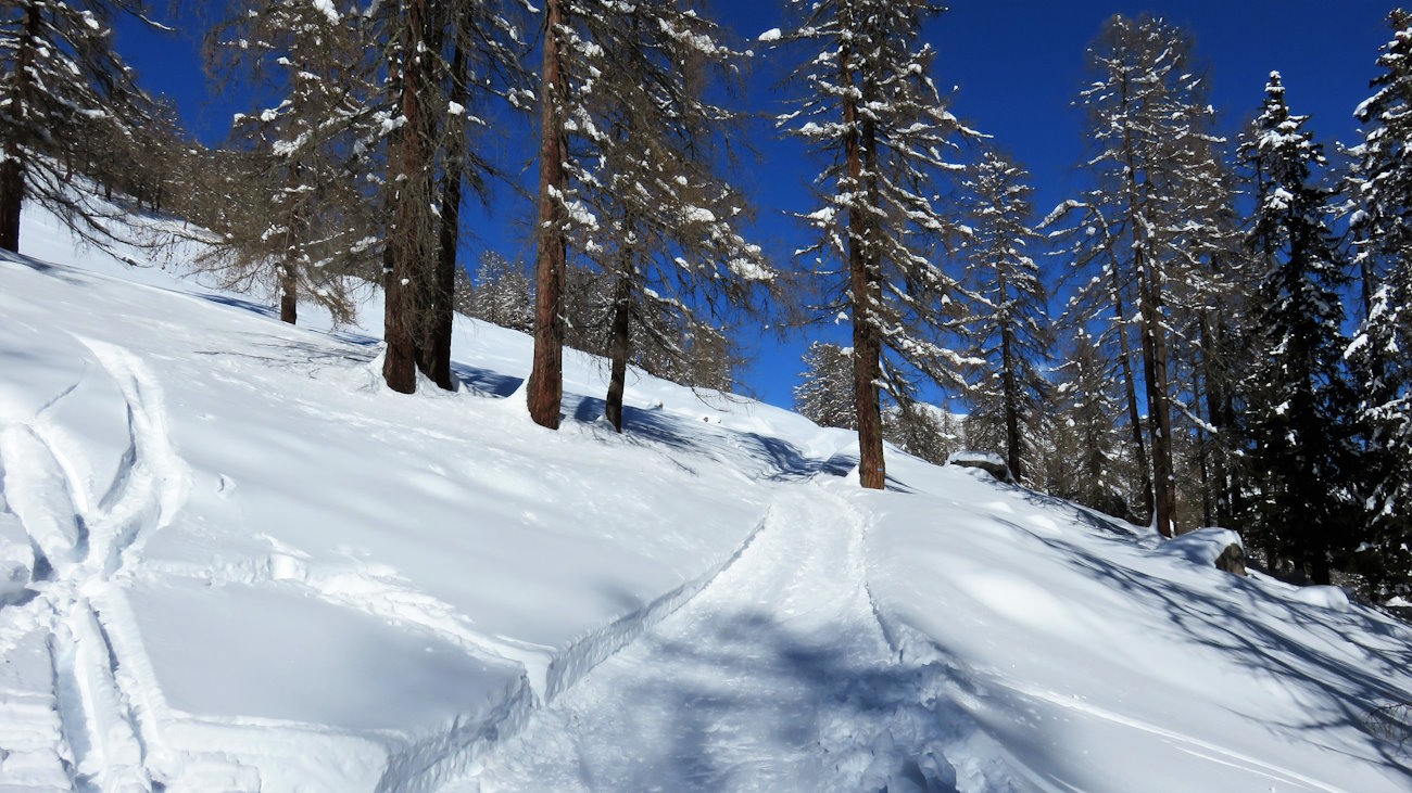 A volte mi cede la neve sotto la ciaspola e il piede mi slitta indietro. Qualche timore inizia a venirmi e spesso mi fermo chiedendomi il perché non sia rimasto in carreggiata. Ma il bello è che, per tutto questo tratto, la cosa mi piace molto di più di quando seguivo la pista già tracciata! Calpestare la neve fresca tra gli alberi, seguire tracce di animali sulla neve regalano sensazioni uniche. Sto facendo un mio percorso.