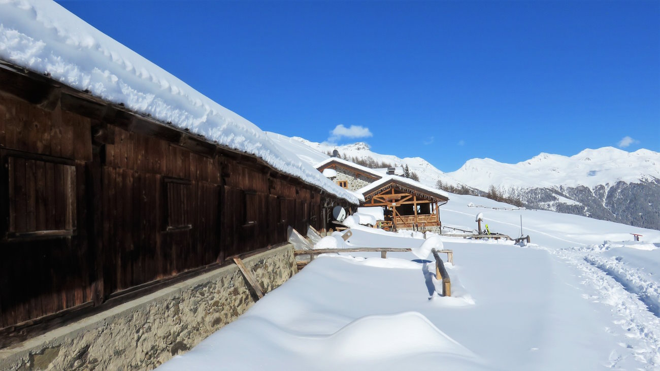 Mi prendo in giro da solo e, facendo finta di nulla, proseguo più agevolmente fino ad arrivare alla Malga Monte Sole Alta, una struttura molto grande che si trova già nel Parco Nazionale dello Stelvio e che, dopo la ristrutturazione del 2015, fa anche da rifugio. Dispone di quattro camere da letto, di una grande sala da pranzo e di una bella veranda, il tutto, data la sua posizione, con una vista incredibile sulla Val di Cercen, sulla Val di Rabbi e su tutti i monti circostanti. La cosa bella è che la malga è aperta anche in questa stagione e io ne approfitto per reintegrare le energie.