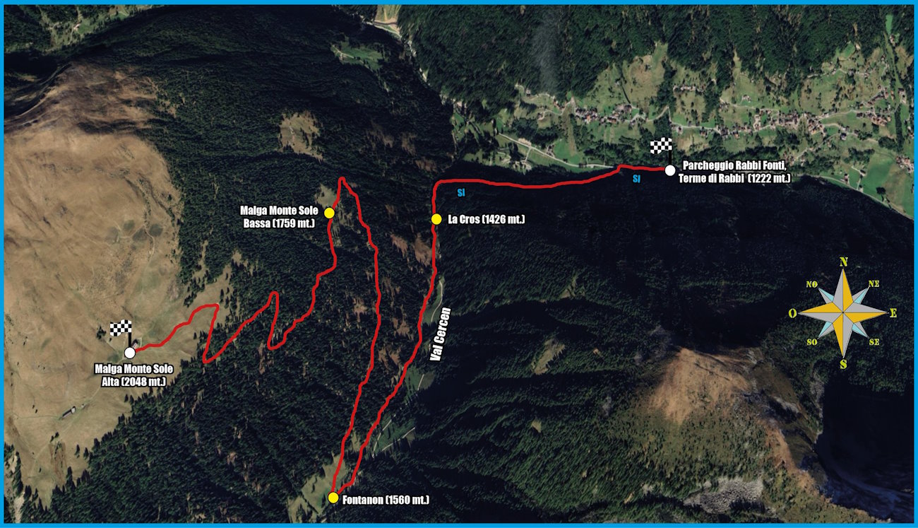 Tappe del percorso: Parcheggio Rabbi Fonti - La Cros - Fontanon - Malga Monte Sole Bassa - Malga Monte Sole Alta - Malga Monte Sole Bassa - Fontanon - La Cros - Parcheggio Rabbi Fonti