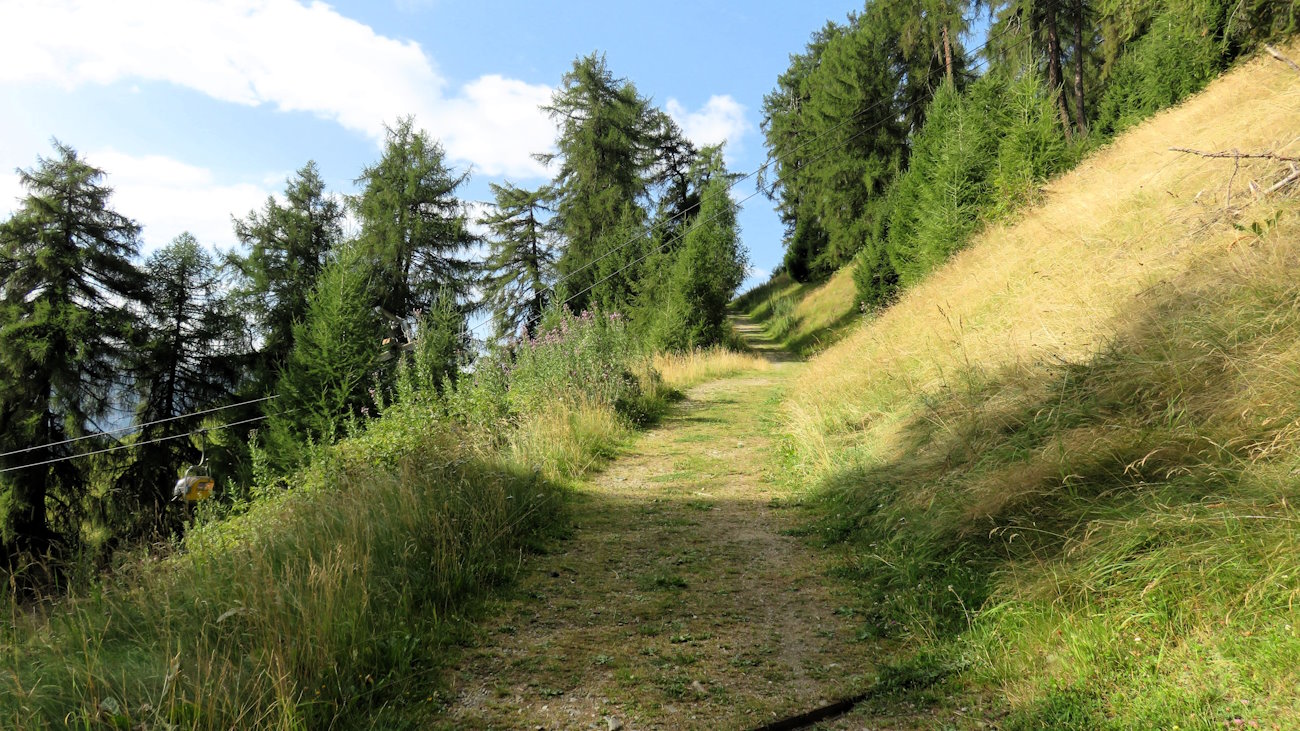 Inizio quindi a salire per una larga traccia erbosa e a buttare nelle gambe i primi metri di dislivello, un po’ in mezzo alla natura e un po’, purtroppo, sotto i piloni della seggiovia-cabinovia. Ma perché rovinare posti così belli, dico io?