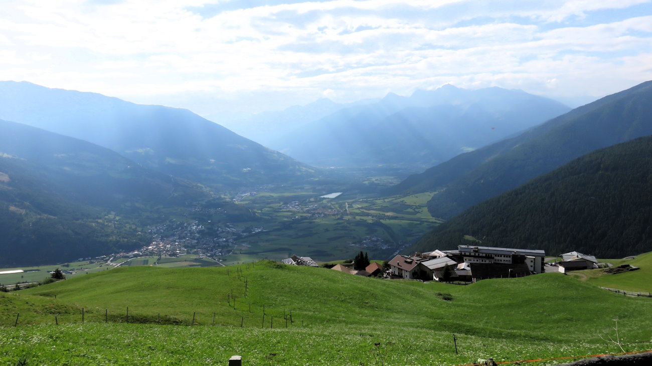 A zig-zag, tagliando prati immacolati dove non un filo d’erba è fuori posto, il mio passo nel salire è lento, la cadenza lieve. Lo sguardo è tutto verso la Val Venosta che da qui la vedo estendersi fino all’imboccatura della Valle di Trafoi. Ecco, infatti, il poderoso Ortles, che però con la foschia mattutina non è ben delineato nei suoi contorni. Si vede e non si vede, il sole tradisce... ma che atmosfera! A qualche metro di distanza sotto ai miei piedi, le ultime case di Pramajur non si scorgono quasi più.
