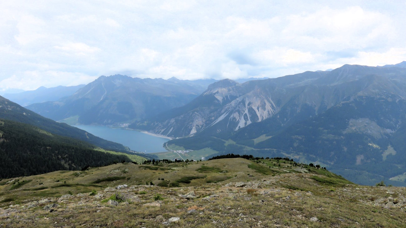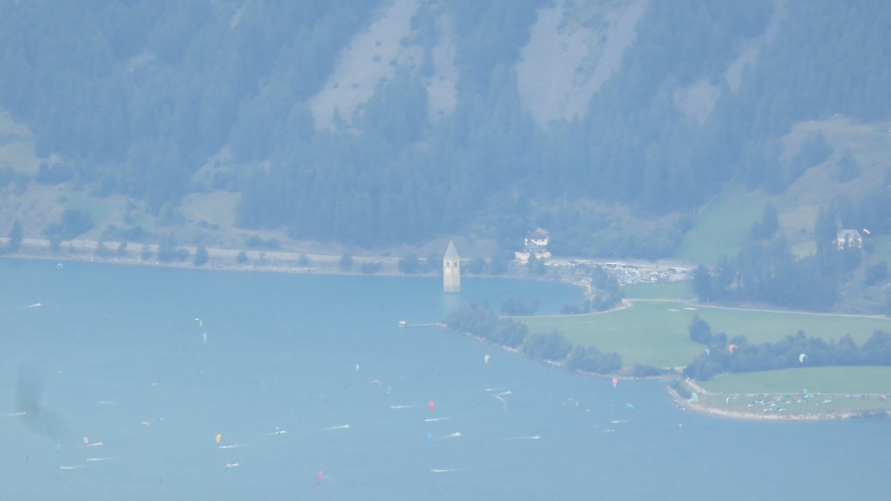 Un misero palo di legno scorticato posto in verticale segna la vetta della cima delle Pecore. Ansioso, col cuore in mano, scruto in basso. Eureka! Il mitico lago di Resia (l’avevate capito scommetto) si mostra a me! E quel paesello, a circa metà di esso, deve essere Curon Venosta, con l’imbocco della Vallelunga!