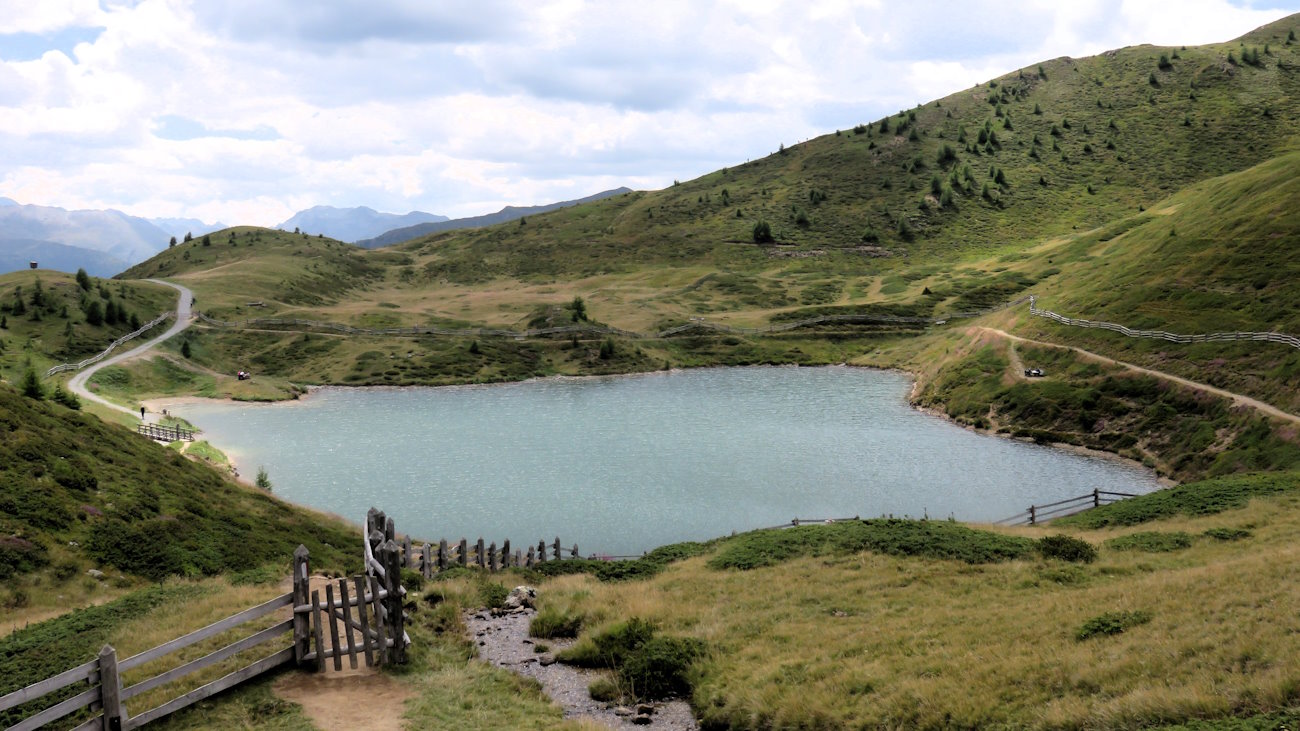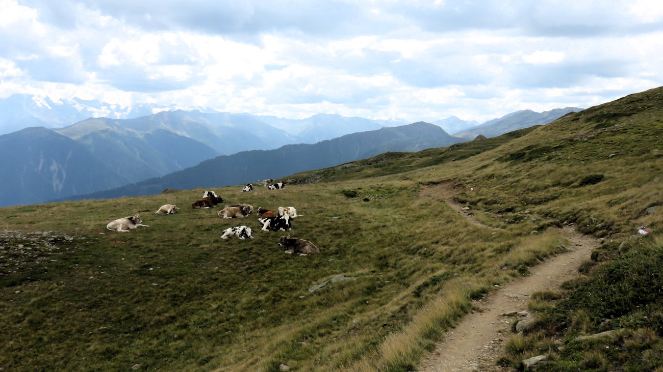 Giunto ad un’evidente deviazione, trascuro la via dritta che prosegue in Val Slingia e svolto bruscamente verso destra, dove mi attende una bella e lunga rampetta in salita dalla quale, fin dai primi metri, emana il caratteristico profumo di... alpeggio (ci siamo capiti, dai). In cima a questa, seguo le indicazioni per la Höferalm, sulla sinistra; non manca molto ormai. Qualche altro bel ghirigori su questo pendio assolato e mi ritrovo in una lingua di terra circondato da immensi prati a pascolo poi, d’improvviso, un cancelletto.