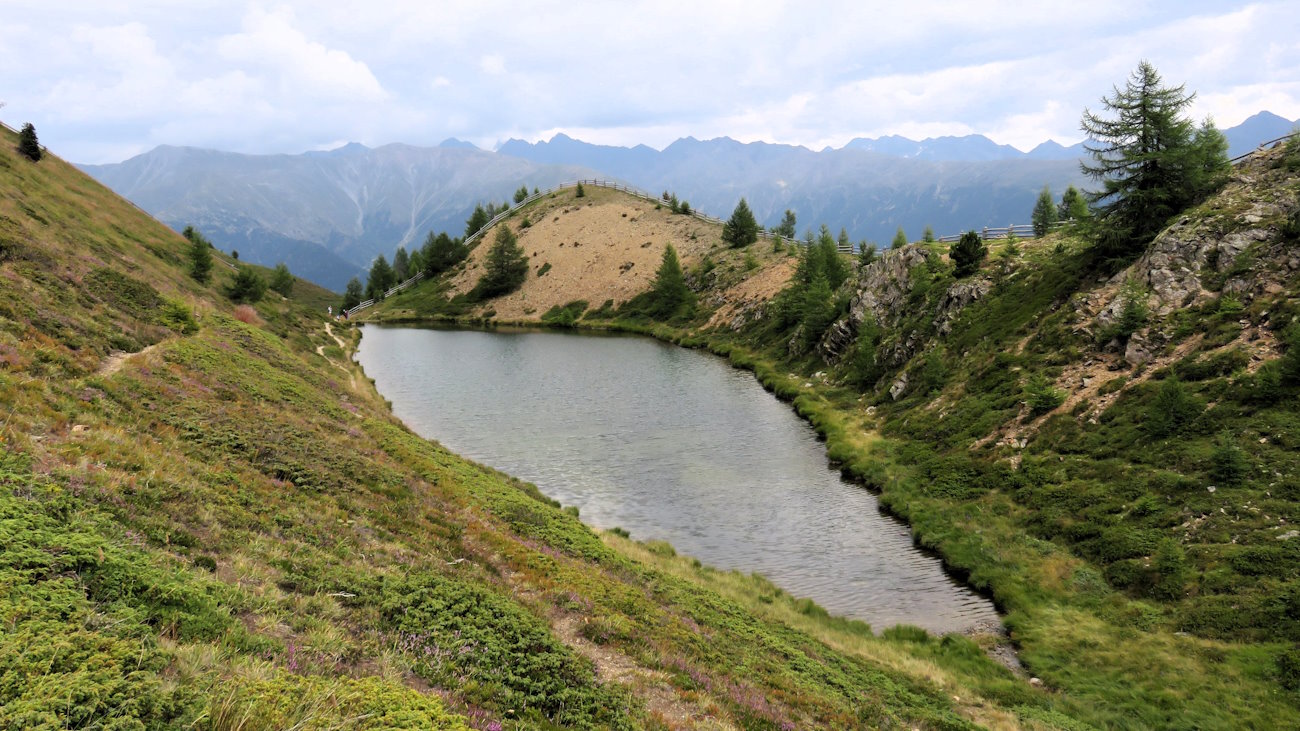 Lasciata l’auto nel parcheggio di Pramajur (1750 mt.) si prosegue a piedi verso nord, aggirando sulla destra la stazione a valle della seggiovia del Plantapatsch-Waltes e continuando lungo la sterrata. Al primo bivio ci si tiene sulla sinistra (sentiero n° 3) e, dopo due tornanti, al nuovo bivio ancora a sinistra (n° 3). Si continua in piano o in leggera salita in direzione sud-ovest: il sentiero, largo e panoramico, è chiamato anche Plaffenseerunde (Giro del Lago del Prete). Ad un’evidente svolta, si tralascia la via dritta che prosegue in Val Slingia e si insiste salendo verso destra. Sempre seguendo il sentiero n° 3 si giunge, dopo una svolta sulla sinistra posta al termine di una rampa e qualche tornante, alla Malga Höfer (2066 mt., 1h 15’). Dall’alpeggio la via n° 3 continua sulla sinistra alle spalle degli edifici fino al soprastante Rifugio Plantapatsch (2150 mt., 1h 40’); volendo, dalla malga si può procedere dritti lungo la pista di sci per accorciare un po’ la salita. Dal rifugio si continua verso nord; quando la traccia svolta verso destra, anziché seguirla si può procedere ancora dritto, direttamente sotto i piloni dell’impianto di risalita. In questo modo la via risulterà un po’ più ripida ma più breve. In ogni caso, la pista n° 3 si ricollega più a monte lungo questa “direttissima”, sotto i piloni del suddetto impianto. L’ultimo tratto è in comune. Al termine dell’ascesa ci si troverà accanto alla stazione a monte della seggiovia Plantapatsch-Watles. Nei pressi, è anche un punto panoramico con una struttura di legno (Watles Top, 2480 mt., 2h 25’). Dalla stazione ci si raccorda sulla destra per l’evidente traccia che risale sulla cima del Monte Vatles-Watles (2555 mt., 2h 45’). Il dislivello è praticamente finito, inizia ora un tratto in quota in leggera discesa. Seguendo l’unico sentiero esistente (n° 4 ora) si continua in direzione nord-est passando dapprima poco sotto la piccola vetta del Galtberg (2537 mt., 2h 55’), per poi scendere con più decisione fino ad incontrare un bivio (3h 10’). Ignorando la traccia sulla sinistra che porterebbe nella Zerzertal (Valle di Serres) e per il momento trascurando anche la via di discesa sulla destra, occorre procedere innanzi per toccare la vetta del Monte delle Pecore (Schafberg, 2411 mt., 3h 20’)). Dal bivio a questa vetta non esiste una vera e propria traccia, ci si muove per prati e massi senza una via obbligata. La sua sommità è segnalata da un tronco d’albero verticale. Tornati sui propri passi fino al bivio (3h 30’), ci si tiene sulla sinistra e si scende verso i Laghi del Prete e il Rifugio Plantapatsch (sempre traccia n° 4). Oltrepassate numerose pozze che fungono da abbeveratoi per il bestiame, si giunge finalmente ai Laghi del Prete (2240 mt., 4h), che si dividono in Grande e Piccolo, entrambi però attaccati. Continuando la discesa (ora sentiero 4A), si passa nuovamente dal Rifugio Plantapatsch (4h 20’), per poi raccordarsi con la via seguita all’andata, che si segue fino a tornare a Pramajur (5h 20’).