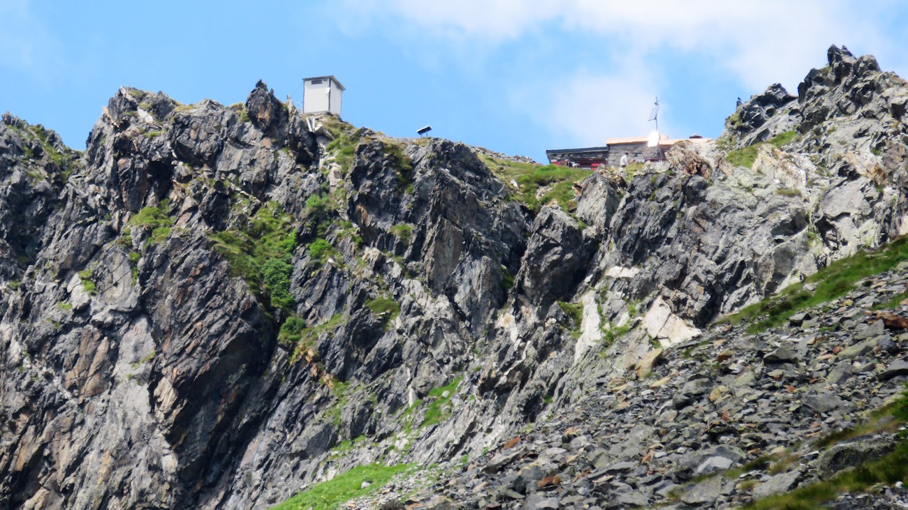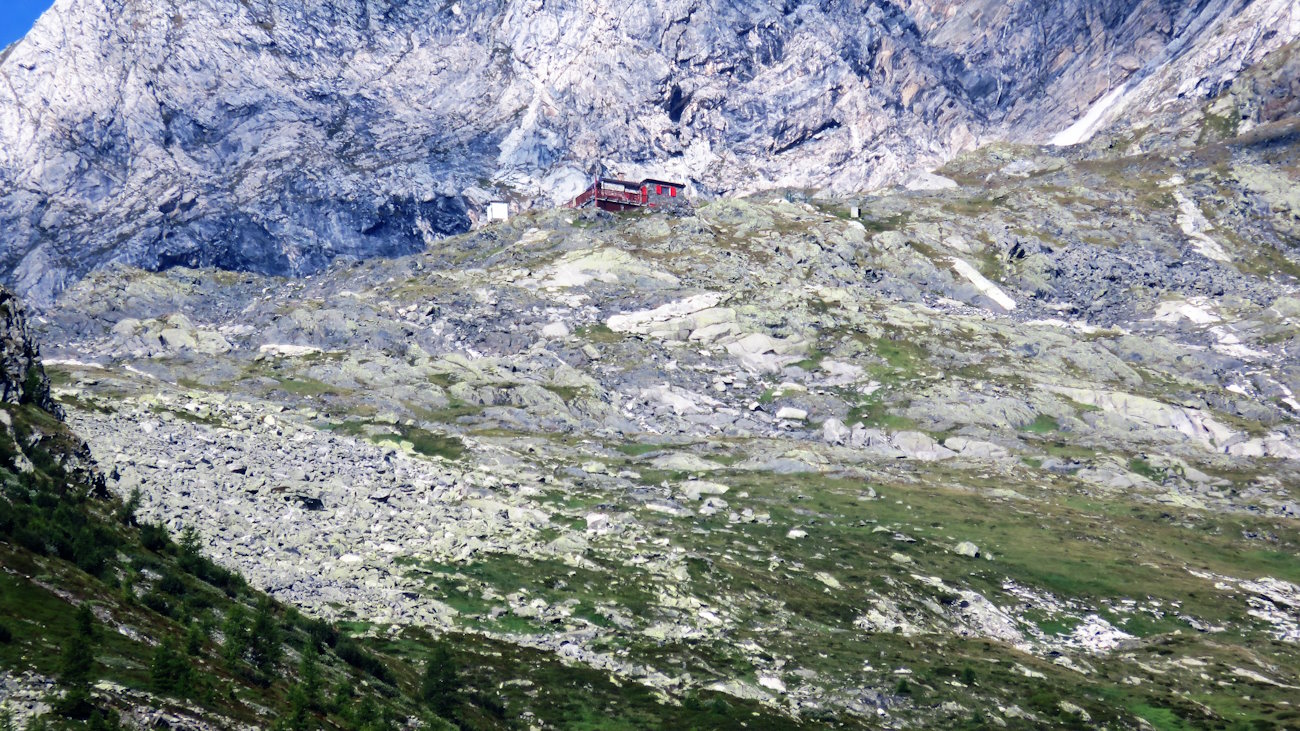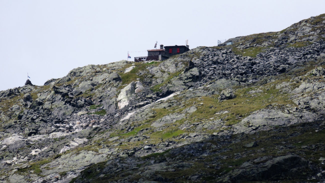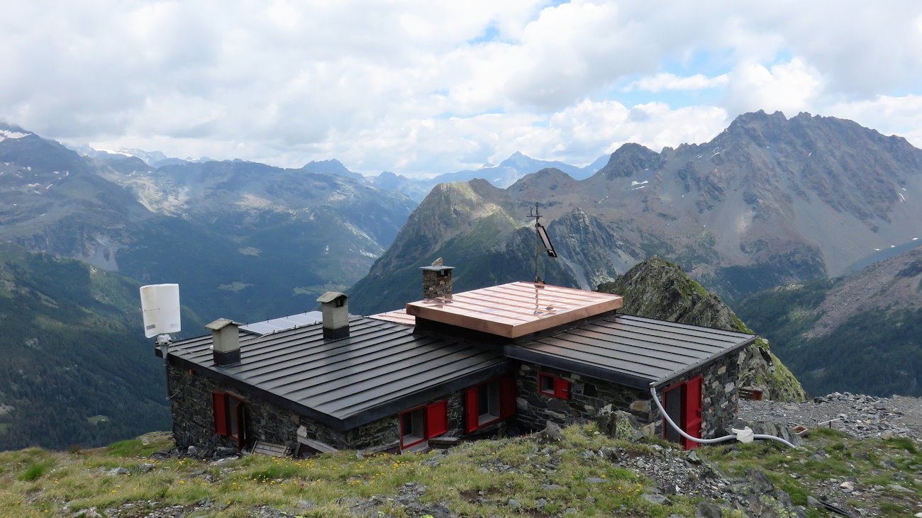 La meta finale, il termine della mia ascesa la vedo bene dal punto in cui mi trovo. Il rifugio Camerini si staglia nel cielo proprio su quella dorsale rocciosa che scende dalla Cima Vazzeda. Inconfondibile, le sue bandiere e banderuole sventolano come non mai! Dall’Alpe Vazzeda Superiore mi aspetta quindi ancora un piccolo (si fa per dire) sforzo. Rimonto adagio qualche altra curva di dislivello più o meno diretta, fino ad una decisa svolta verso sud. Ora di fronte a me c’è solo un lungo tratto a mezzacosta con pendenze decisamente più gradevoli. In lontananza, la cresta rocciosa e in particolare l’incavo dove è ubicato il rifugio anticipa la visione pazzesca sul Monte Disgrazia, coi suoi ghiacciai e la sua massa rocciosa che non lasciano scampo agli occhi. Ipnotizzato, fisso anche questa cartolina! Tutta la fatica scompare, le gambe tornano quasi come nuove. Se possibile rallento ancora il passo, in modo che l’ultima parte del viaggio non finisca troppo presto. Che fretta ho di “tirare”? “Ma guarda che meraviglia, pazzesco”. Un po’ più avanti giungo ad un guado che mi fa anche fare un po’ stretching alle gambe, dovendo decisamente allungarle per non finire col piede dentro. Ma che spettacolo e che varietà di ambienti! Non vorrei nulla di meno da un percorso simile! Un altro tratto, altre foto cartolina, poi nuovo un guado un po’ più semplice del precedente. Lentamente salgo e quasi non mi accorgo. Qui, come dicevo, le fatiche scompaiono, troppo distratti da ciò che ci circonda. Arrivo proprio sotto al rifugio, ai piedi delle rocce sulle quali è adagiato. È l’ultimo sforzo, l’ultimo tratto su roccette da affrontare prima di toccare con mano le pietre della struttura e le famose ante rosse delle finestre il cui colore spicca persino dal Pian del Lupo. È fatta e ora posso finalmente godermi lo show che ho davanti a me, ossia il massiccio del Disgrazia. Qui mi siedo e per almeno un’ora nessuno mi schioda più! Il panorama a 2580 mt. è di prim’ordine: di fronte il Disgrazia col suo ghiacciaio alquanto tormentato, il Pizzo Ventina, il Monte Pioda, la Cima Centrale di Chiareggio, la Cima del Duca, il Pizzo Scalino (più in lontananza). Più defilati il Monte del Forno, la Valle del Muretto e, alle spalle del rifugio, la rocciosa Cima Vazzeda. Cosa volere ancora oltretutto con questa giornata luminosa? Approfitto della mia pausa per riportare qualche informazione storica di questo rifugio: