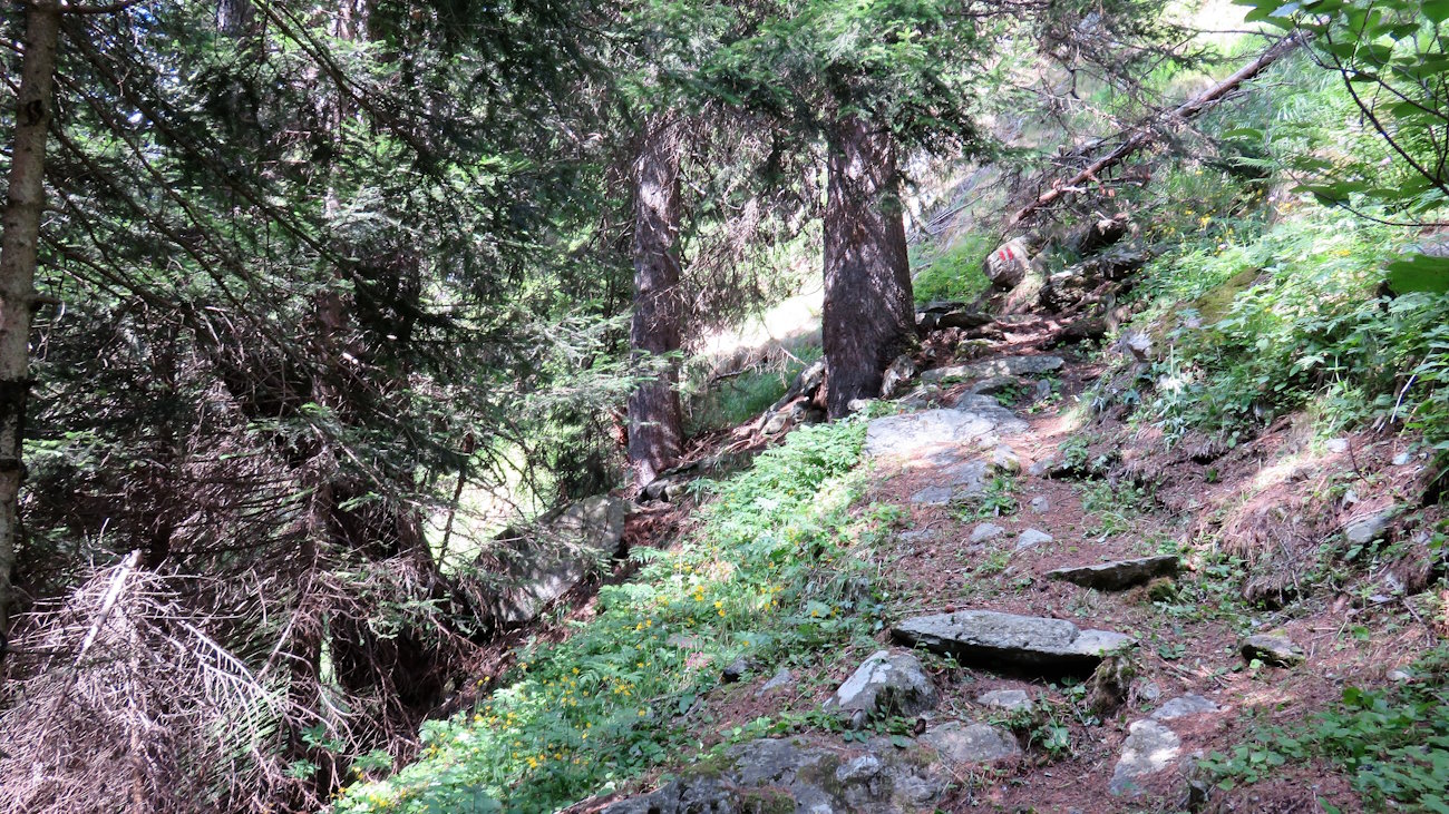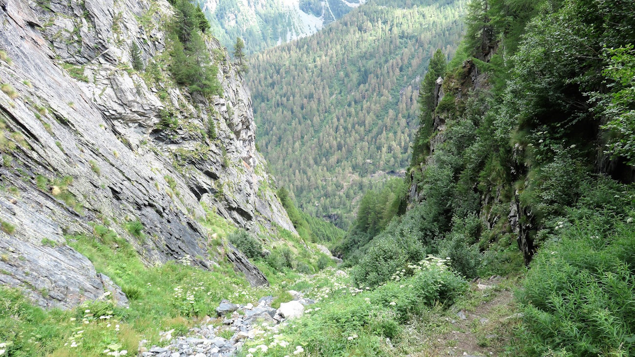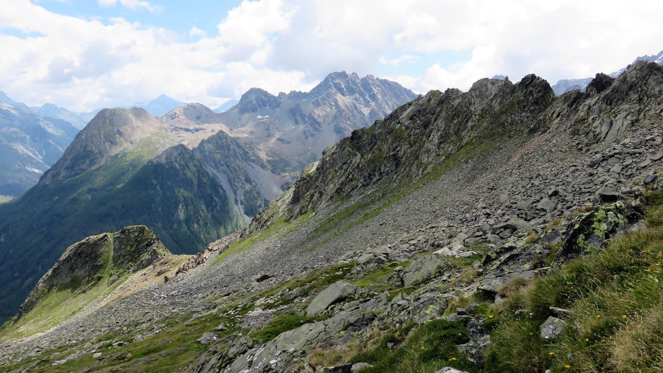 Ebbene sì, il sole se ne è quasi andato. Una massa nuvolosa (innocua per fortuna) ha oscurato lentamente l’astro più luminoso, creando ovunque giochi di luce ed ombra davvero suggestivi. Le montagne stanno lentamente mettendo il cappello e ciò mi fa capire che è ora di avviarmi verso valle. Il fondovalle già lo vedo dal rifugio ma quanto è lontano! Di fronte a me, in linea d’aria con la struttura e un poco più in basso si innalza come una scaglia di dinosauro una roccia (un monticello) davvero particolare: è il Monte Mottuccio che divide in due, di fatto, il percorso di discesa. Stando sulla sinistra ritornerei a valle per il percorso di andata. Portandomi a destra, invece, proverei l’intrigante discesa verso la Valle Sissone. Siccome quando posso cerco sempre di sviluppare un anello, opto per questa seconda soluzione. Il Monte Mottuccio è sostanzialmente il prolungamento della dorsale est della Cima Vazzeda ma dritti proprio non si può passare essendo esso fatto a scaglia e presentando una cresta rocciosa sottile e affilata. Il sentiero di discesa, sempre il n° 301 per ora, si porta fin sotto tale scaglia per poi deviare bruscamente verso destra e l’Alpe Sissone. Mi abbasso quindi lentamente per qualche metro lungo la dorsale con un sorriso stampato che più grande non si può. “Ci credo”, mi dico, “guarda dove mi trovo e in che scenario! Ora sto addirittura camminando sul filo della dorsale, ai piedi di questo montucolo dalla forma bizzarra e che nasconde solo in parte il panorama di fronte, la Val Ventina e la Valmalenco!” Sembra di muoversi camminando nell’aria, sembra di volare! Ad un tratto, assorto nei miei pensieri, incontro una coppia con un cane lupo che mi ferma e mi chiede per la discesa lungo questo versante. Io, che ho già visto ciò che mi aspetta tra poco, rispondo loro che col cane non è possibile, meglio che ritornino per la via ordinaria, verso l’Alpe Vazzeda. Tra qualche metro, un importante salto di roccia costringerà infatti a girarsi verso monte per scendere un tratto attrezzato con catene; una disarrampicata non proprio fattibile per un cane lupo. Dopo i saluti giungo infatti al punto più tecnico del percorso. A vedere il tutto da quassù sembra un salto importante ma in realtà, pur essendo piuttosto verticale, con la dovuta calma e attenzione non pone particolari problemi e non richiede attrezzatura. Solo quando i miei piedi ritoccano il suolo qualche metro più in basso capisco di aver fatto bene a consigliare alla coppia di non passare per questo punto. A vedere il passaggio da qui fa un po’ più impressione e di certo un cane su questi 30 metri circa si sarebbe fatto sicuramente male. Sono dunque di nuovo coi piedi ben saldi sull’erba e mi accingo a seguire il sentiero che vedo zigzagare verso valle attraversando prati lungo un pendio piuttosto ripido. Un ultimo saluto al Disgrazia e a tutte le meraviglie che mi circondano e via! Dopo qualche metro giungo ad un bivio nel quale tengo la sinistra. Il numero del sentiero cambia e diventa il n° 325. Poco più in basso tocco l’Alpe Sissone composta perlopiù da qualche baita diroccata e, credo, non più monticata. Mi abbasso lentamente sempre più: ora la traccia torna verso est e si affaccia, senza esposizione, verso la Valle Sissone. Cammino sull’erba morbida con un panorama da urlo verso la Valmalenco che vedo di fronte a me. Non c’è nessuno, non uno che scende o sale. Oggi la montagna è tutta per me. Passo sotto protuberanze rocciose impressionanti, taglio per prati bellissimi e fioriti dove qua e là cominciano a spuntare i primi abeti isolati. Dopo un tratto a mezza costa verso nord arrivo all’ennesimo punto spettacolare di questo percorso. Rimango sorpreso e spiazzato, una discesa così bella e “wild” non ricordo di averla mai fatta. Sono praticamente a monte di un canalone erboso-roccioso ripidissimo, un colatoio chiuso da pareti rocciose verticali impressionanti. Nel mezzo, io. Davanti a me, una pista che, non si sa come, scende per il suddetto canalone in modo pazzesco. Rimango fermo, in piedi, stupito. Infatti, in un primo momento non credo affatto si possa passare da qui. Penso di aver sbagliato strada, di trovarmi in un vicolo cieco e costretto a ritornare sui miei passi per cercare una via migliore. Ma i miei occhi non si staccano dalla bellezza di questo canalone che attrae e mi chiama. In ogni caso guardo e riguardo la mia cartina: no, il percorso è giusto, non ho sbagliato. Scendo dunque un passetto alla volta, pensando prima o poi di trovarmi di fronte ad un salto roccioso non praticabile. Ma la temuta scena non si verifica. Continuo a scendere e il sentiero, curva dopo curva, si abbassa con una sinuosità impensabile. Non vi sono parole per descrivere l’esperienza di una discesa circondato da queste rocce che sembrano opprimere ma che invece guidano i propri passi. E l’esperienza, l’emozione di passare di qui, bisogna viverla. Sono ormai a metà canalone, rallento. Il percorso dall’alto non sembrava ma è davvero facile, sempre escursionistico. Scendo ancora ma un po’ mi dispiace, non vorrei mai finisse così presto la discesa. Ai piedi delle rocce la pista svolta di nuovo verso est, in un tratto un po’ esposto ma che lascia senza fiato per la bellezza dei monti che mi circondano. La traccia è comunque piuttosto larga e, a meno di non soffrire attacchi di panico, è alla portata di tutti a livello di vertigini. Oltre questo punto sono di nuovo nel bosco, a mezza costa, tra larici ed abeti. Manca poco al fondovalle, solo un altro paio di zig-zag in questo bosco bellissimo. La gita è quasi giunta al termine, purtroppo. Giunto a lambire il torrente Sissone, non mi resta che portarmi verso Pian del Lupo. Un bivio poco più avanti mi porta a tenere la destra (a sinistra risalirei verso il Rifugio Tartaglione Crispo), fino all’Alpe Laresin. Da qui al parcheggio è cosa da nulla in quanto ripercorro la stessa via dell’andata. Ma,
