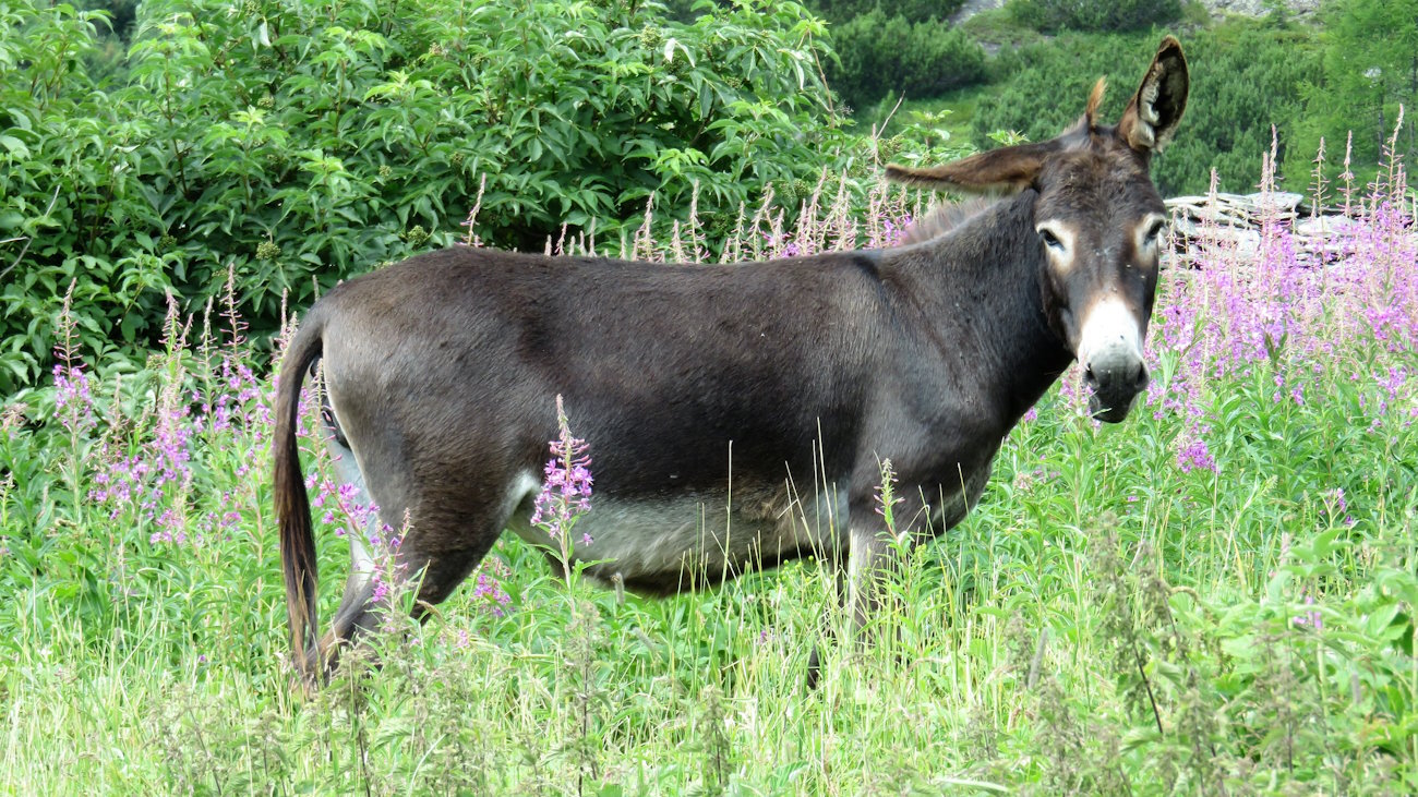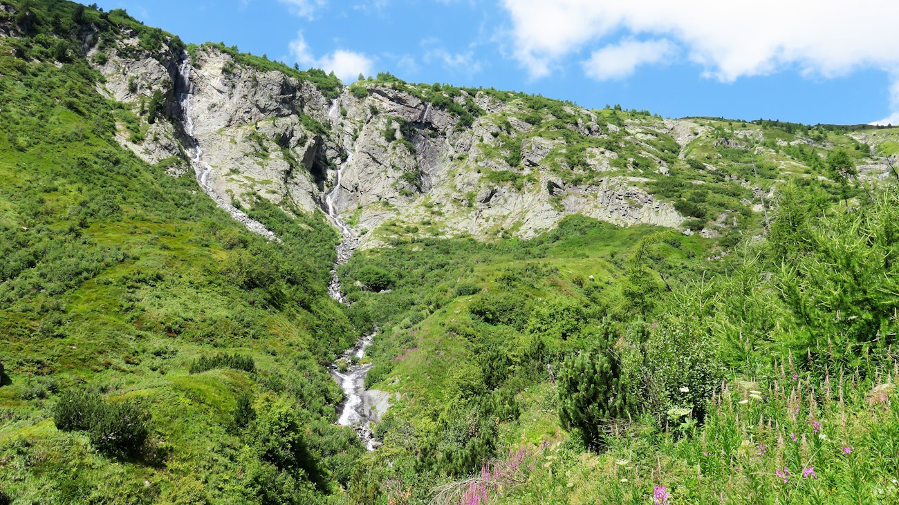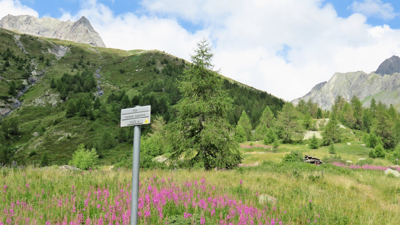La gita è ancora lunga e un po’ di dislivello è ancora da “buttare giù”. Anzi, “su” per dirla tutta. Vorrei restare qui tutto il giorno ma le gambe si sono già mosse da sole, tanto che il cuore e l’anima, lasciati su quel terrazzino, devono affrettare il passo per ricongiungersi con esse! A nord-ovest del rifugio parte dunque la traccia che porta agli alpeggi di cui il titoletto, così che mi ci butto con un bel salto. Uno solo però, dato che la salita è appena cominciata. Fortunatamente cammino sempre all’ombra di un bosco che, se possibile, qui incanta chiunque. Inizio proprio a respirare il profumo della natura, l’ambiente isolato e solitario; inizio a concentrarmi sui rumori del bosco, gli scricchiolii di qualche ramo che si spezza, di un cinguettio, di un picchio intento a sforacchiare il legno. E, per fortuna, non incontro folle di persone, tutt’altro. Sono solo io e il bosco. L'unico su questo pendio che si eleva fin sulla punta Vazzeda. Salgo sempre di più, un passo dopo l’altro, lento ma costante. Dopo una lunga rampa verso ovest, una svolta mi riporta verso est, all’inizio sempre in salita e poi, gradatamente in piano. Ogni tanto una finestra nel bosco mi spara in faccia uno scorcio di panorama, in questo caso i pascoli e le rocce del Monte dell’Oro. Oltrepasso la località segnata come Pian dei Vitelli, senza più fatica ma lungo un sentiero incredibile, una lingua grigio-rossa che serpeggia su questo versante. Continuo così per un bel po’, con qualche saliscendi ed alcune piccole discese, fino a ricongiungermi col Sentiero n° 301 che sale diretto da Pian del Lupo. Qualche metro ancora e poso i piedi su di un simpatico ponticello di legno posto poco prima del bivio per l’Alpe Vazzeda Inferiore. Anche questo luogo è davvero unico, un appassionato di fotografia potrebbe sbizzarrirsi ed andare a nozze. Il pendio alla mia sinistra, al contrario, è un po’ spoglio e desolato: molti alberi divelti, tronchi spaccati, segno evidente dell’azione di qualche valanga o fulmine. Al suddetto bivio tralascio sulla destra il sentiero per l’Alpe Monterosso e seguo sempre le indicazioni che, in salita più decisa questa volta, portano all’Alpe Vazzeda Superiore. Trenta minuti da qui non sono poi molti, dai. Il bosco è finito poco prima del ponte e ora davanti a me si estendono prati e pascoli. Solo qua e là, in forma quasi nana spuntano isolati gli ultimi abeti. Il sole splende e la temperatura aumenta un po’ ma in compenso la quota (già quasi 2000 mt.) fa sì che il clima si mantenga sempre assai gradevole. Davanti a me il sentiero si inoltra nella bassa vegetazione verso un salto roccioso dal quale scendono numerosi rivoli d’acqua. Per un attimo penso: “Che salto incredibile e che salita sarebbe se l’Alpe Vazzeda Superiore si trovasse proprio in cima ad esso!”. “Ma no, magari è più verso destra, lungo un percorso più soft” continuo tra me e me tenendo sempre un passo calmo e godendomi questi scenari maestosi. La realtà mi si para davanti poco dopo; altro che verso destra e pendio soft, la salita tira dritto come un mulo a fianco le roccette! Va beh, dai, avanti! Boschi immensi mi circondano e ora anche qualche cima mi ripaga dello sforzo. Alle mie spalle iniziano a comparire le prime propaggini del Disgrazia; finalmente! Con esso, direttamente di fronte ma molto più in basso ecco anche la Val Ventina coi rifugi Gerli-Porro e Ventina. Su di un terrazzino erboso, dopo qualche curva e contro-curva, un cartello solitario posto nel nulla mi indica la direzione, verso un salto roccioso non difficile da superare ma che mi fa notare il cambio di scenario quasi brusco: si passa dalla media all’alta montagna. Da qui al Rifugio Del Grande Camerini mancano circa due ore. Superato il balzo di roccia uno spettacolo da fiaba mi accoglie e mi da il benvenuto, con una buona vista sulla Valle del Muretto alla mia destra e, di fronte a me, estesi pascoli in fiore nei quali l’epilobio (Epilobium angustifolium) la fa da padrone, tingendo tutto di lilla. Wow!!! Ma il vero teatro appare alla mia sinistra dove dall’immenso balzo roccioso che vedevo da sotto scende un gran numero di cascate e, sopra di loro, la Cima Vazzeda che sembra toccare il cielo. Mi sento meno che una formica! Tanto per fare un esempio, per riuscire a vederne la punta mi tocca alzare proprio tutta la testa. Ai piedi delle rocce si vede proprio una linea, quasi netta, dove anche l’erba molla il colpo e lascia il posto alle rocce e ai nevai residui. Distratto come sono nel guardare a destra e a sinistra non mi accorgo di essere a mia volta guardato. Chi lo fa è un curiosone poco distante da me, solo qualche metro, ma io mica l’avevo notato. È bellissimo e davvero buffo, con un orecchio su e uno giù. Eccolo qui, un magnifico asino a cui presto se ne affianca un altro! Sono circondati dal lilla degli epilobi e non smettono di fissarmi. A loro sembrerò forse un alieno? Magari alieno no, ma un po’ matto sì. Secondo me hanno capito le mie intenzioni escursionistiche e la mia meta e in questo momento stanno ridendo; quell’orecchio abbassato sembra dirmi proprio questo!